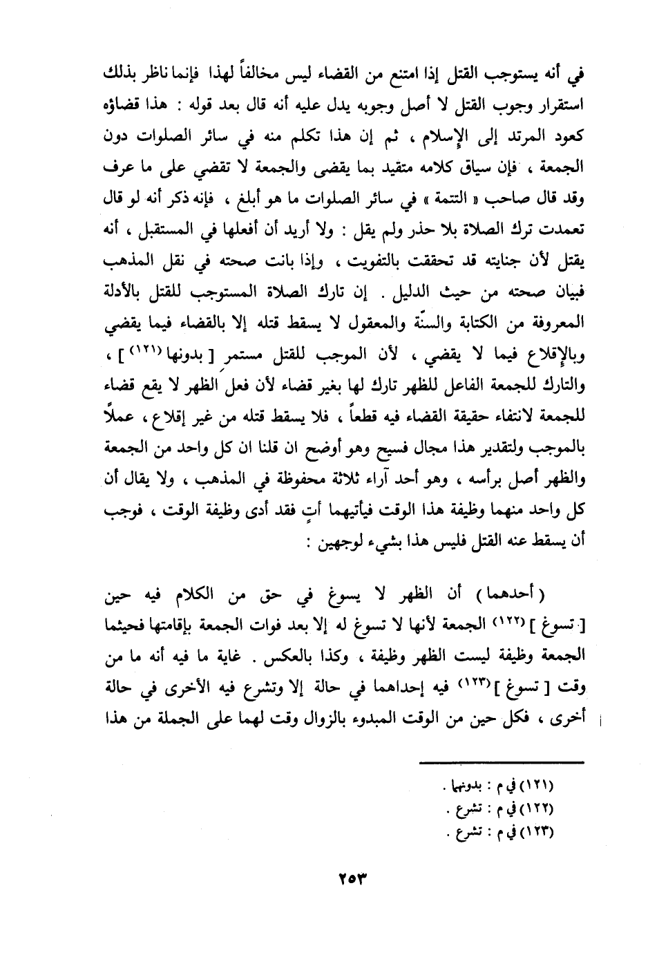 @ فِي أَنه يسْتَوْجب الْقَتْل إِذا امْتنع من الْقَضَاء لَيْسَ مُخَالفا لهَذَا فَإِنَّمَا نَاظر بذلك اسْتِقْرَار وجوب الْقَتْل لَا أصل وُجُوبه يدل عَلَيْهِ أَنه قَالَ بعد قَوْله هَذَا قَضَاؤُهُ كعود الْمُرْتَد إِلَى الْإِسْلَام ثمَّ إِن هَذَا تكلم مِنْهُ فِي سَائِر الصَّلَوَات دون الْجُمُعَة فَإِن سِيَاق كَلَامه متقيد بِمَا يقْضِي وَالْجُمُعَة لَا تقضي على مَا عرف وَقد قَالَ صَاحب التَّتِمَّة فِي سَائِر الصَّلَوَات مَا هُوَ أبلغ فَإِنَّهُ ذكر أَنه لَو قَالَ تَعَمّدت ترك الصَّلَاة بِلَا حذر وَلم يقل وَلَا أُرِيد أَن أَفعَلهَا فِي الْمُسْتَقْبل أَنه يقتل لِأَن جِنَايَته قد تحققت بالتفويت وَإِذا بَانَتْ صِحَّته فِي نقل الْمَذْهَب فبيان صِحَّته من حَيْثُ الدَّلِيل إِن تَارِك الصَّلَاة المستوجب للْقَتْل بالأدلة الْمَعْرُوفَة من الْكِتَابَة وَالسّنة والمعقول لَا يسْقط قَتله إِلَّا بِالْقضَاءِ فِيمَا يقْضِي وبالإقلاع فِيمَا لَا يقْضِي لِأَن الْمُوجب للْقَتْل مُسْتَمر بِدُونِهَا والتارك للْجُمُعَة الْفَاعِل لِلظهْرِ تَارِك لَهَا بِغَيْر قَضَاء لِأَن فعل الظّهْر لَا يَقع قَضَاء للْجُمُعَة لانْتِفَاء حَقِيقَة الْقَضَاء فِيهِ قطعا فَلَا يسْقط قَتله من غير إقلاع عملا بِالْمُوجبِ ولتقدير هَذَا مجَال فسيح وَهُوَ أوضح أَن قُلْنَا ان كل وَاحِد من الْجُمُعَة وَالظّهْر أصل بِرَأْسِهِ وَهُوَ أحد آراء ثَلَاثَة مَحْفُوظَة فِي الْمَذْهَب وَلَا يُقَال أَن كل وَاحِد مِنْهُمَا وَظِيفَة هَذَا الْوَقْت فيأتيهما أت فقد أدّى وَظِيفَة الْوَقْت فَوَجَبَ أَن يسْقط عَنهُ الْقَتْل فَلَيْسَ هَذَا بِشَيْء لوَجْهَيْنِ