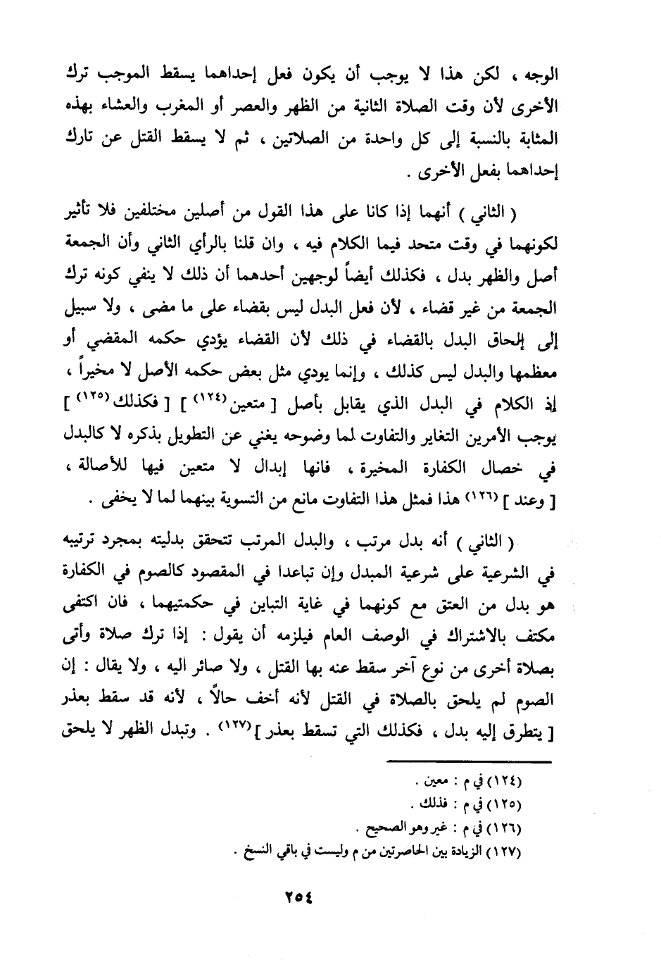 الثَّانِي أَنه بدل مُرَتّب وَالْبدل الْمُرَتّب تتَحَقَّق بدليته بِمُجَرَّد ترتيبه فِي الشَّرْعِيَّة على شَرْعِيَّة الْمُبدل وَإِن تباعدا فِي الْمَقْصُود كَالصَّوْمِ فِي الْكَفَّارَة هُوَ بدل من الْعتْق مَعَ كَونهمَا فِي غَايَة التباين فِي حكمتيهما فان اكْتفى مكتف بالاشتراك فِي الْوَصْف الْعَام فَيلْزمهُ أَن يَقُول إِذا ترك صَلَاة وأتى بِصَلَاة أُخْرَى من نوع آخر سقط عَنهُ بهَا الْقَتْل وَلَا صائر اليه وَلَا يُقَال إِن الصَّوْم لم يحِق بِالصَّلَاةِ فِي الْقَتْل لِأَنَّهُ أخف حَالا لِأَنَّهُ قد سقط بِعُذْر يتَطَرَّق إِلَيْهِ بدل فَكَذَلِك الَّتِي تسْقط بِعُذْر وتبدل الظّهْر لَا يلْحق