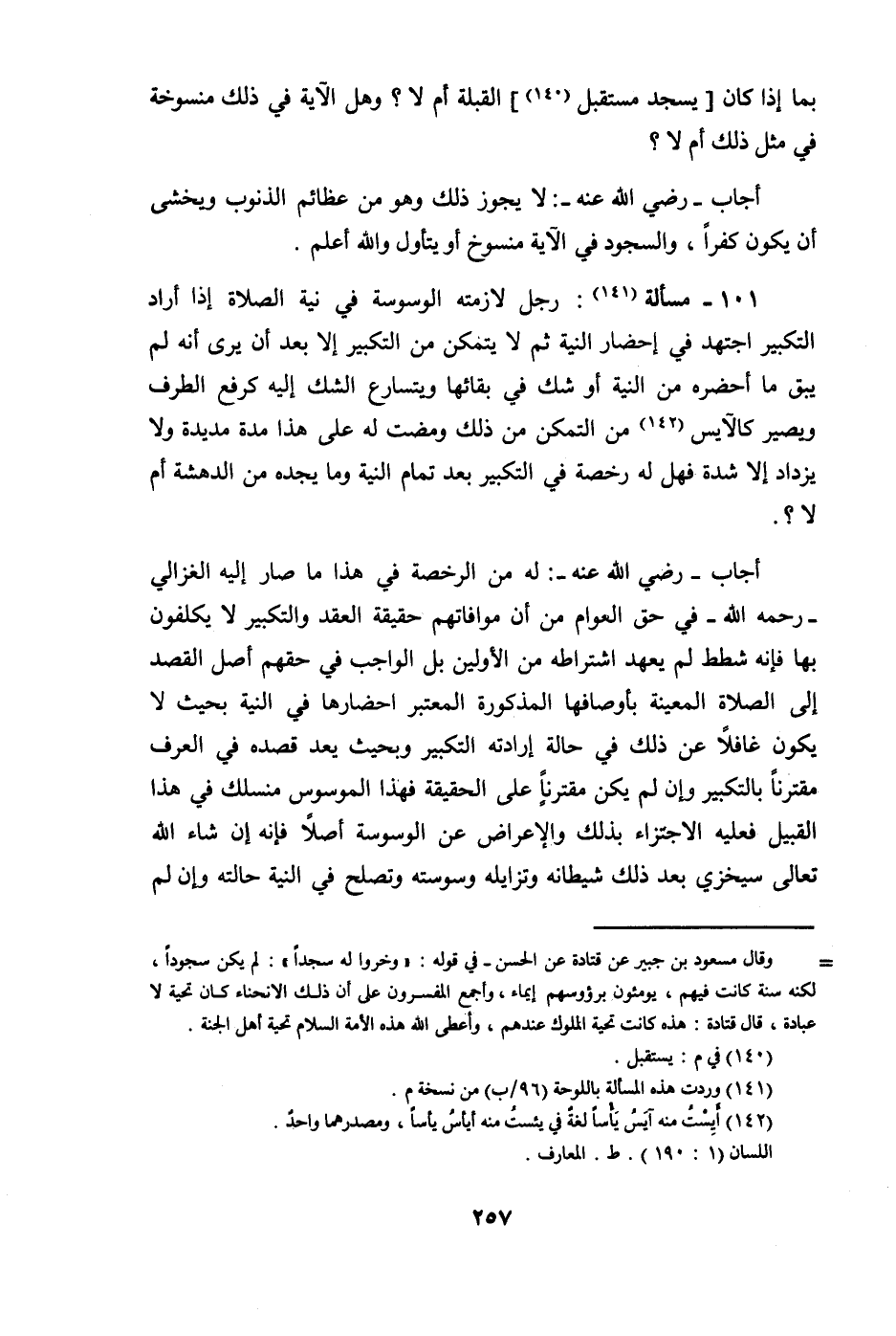 101 - مَسْأَلَة رجل لازمته الوسوسة فِي نِيَّة الصَّلَاة إِذا أَرَادَ التَّكْبِير اجْتهد فِي إِحْضَار النِّيَّة ثمَّ لَا يتَمَكَّن من التَّكْبِير إِلَّا بعد أَن يرى أَنه لم يبْق مَا أحضرهُ من النِّيَّة أَو شكّ فِي بَقَائِهَا ويتسارع الشَّك إِلَيْهِ كرفع الطّرف وَيصير كالآيس من التَّمَكُّن من ذَلِك وَمَضَت لَهُ على هَذَا مُدَّة مديدة وَلَا يزْدَاد إِلَّا شدَّة فَهَل لَهُ رخصَة فِي التَّكْبِير بعد تَمام النِّيَّة وَمَا يجده من الدهشة أم لَا