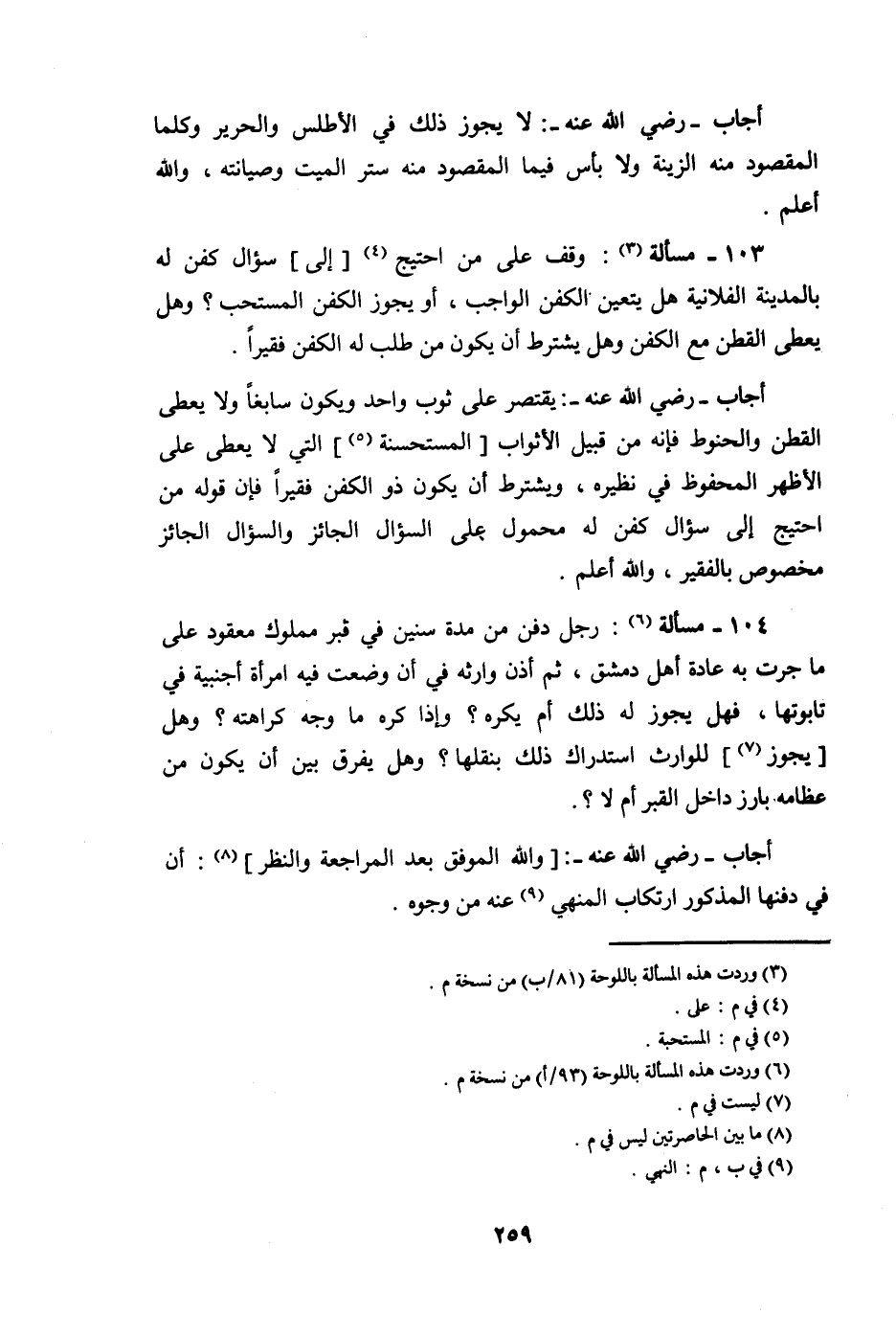 103 - مَسْأَلَة وقف على من احْتِيجَ إِلَى سُؤال كفن لَهُ بِالْمَدِينَةِ الْفُلَانِيَّة هَل يتَعَيَّن الْكَفَن الْوَاجِب أَو يجوز الْكَفَن الْمُسْتَحبّ وَهل يعْطى الْقطن مَعَ الْكَفَن وَهل يشْتَرط أَن يكون من طلب لَهُ الْكَفَن فَقِيرا