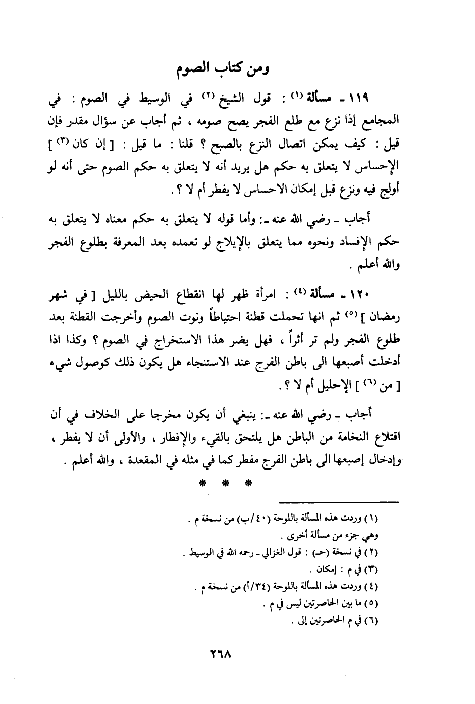 119 - مَسْأَلَة قَول الشَّيْخ فِي الْوَسِيط فِي الصَّوْم فِي المجامع إِذا نزع مَعَ طلع الْفجْر يَصح صَوْمه ثمَّ أجَاب عَن سُؤال مُقَدّر فَإِن قيل كَيفَ يُمكن اتِّصَال النزع بالصبح قُلْنَا مَا قيل إِن كَانَ الإحساس لَا يتَعَلَّق بِهِ حكم هَل يُرِيد أَنه لَا يتَعَلَّق بِهِ حكم الصَّوْم حَتَّى أَنه لَو أولج فِيهِ وَنزع قبل إِمْكَان الاحساس لَا يفْطر أم لَا