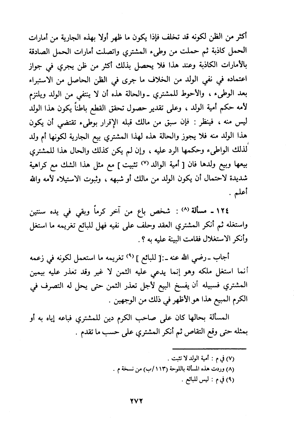 @ أَكثر من الظَّن لكَونه قد تخلف فَإِذا يكون مَا ظهر أَولا بِهَذِهِ الْجَارِيَة من أَمَارَات الْحمل كَاذِبَة ثمَّ حملت من وطىء المُشْتَرِي واتصلت أَمَارَات الْحمل الصادقة بالأمارات الكاذبة وَعند هَذَا فَلَا يحصل بذلك أَكثر من ظن يجْرِي فِي جَوَاز اعْتِمَاده فِي نفي الْوَلَد من الْخلاف مَا جرى فِي الظَّن الْحَاصِل من الِاسْتِبْرَاء بعد الوطىء والأحوط للْمُشْتَرِي وَالْحَالة هَذِه أَن لَا يَنْتَفِي من الْوَلَد ويلتزم لأمة حكم أُميَّة الْوَلَد وعَلى تَقْدِير حُصُول تحقق الْقطع بَاطِنا يكون هَذَا الْوَلَد لَيْسَ مِنْهُ فَينْظر فَإِن سبق من مَالك قبله الْإِقْرَار بوطىء تَقْتَضِي أَن يكون هَذَا الْوَلَد مِنْهُ فَلَا يجوز وَالْحَالة هَذِه لهَذَا المُشْتَرِي بيع الْجَارِيَة لكَونهَا أم ولد لذَلِك الواطىء وَحكمهَا الرَّد عَلَيْهِ وَإِن لم يكن كَذَلِك وَالْحَال هَذَا للْمُشْتَرِي بيعهَا وَبيع وَلَدهَا فان أُميَّة الْوَالِد تثبيت مَعَ مثل هَذَا الشَّك مَعَ كَرَاهِيَة شَدِيدَة لاحْتِمَال أَن يكون الْوَلَد من مَالك أَو شبهه وَثُبُوت الِاسْتِيلَاء لأمة وَالله أعلم