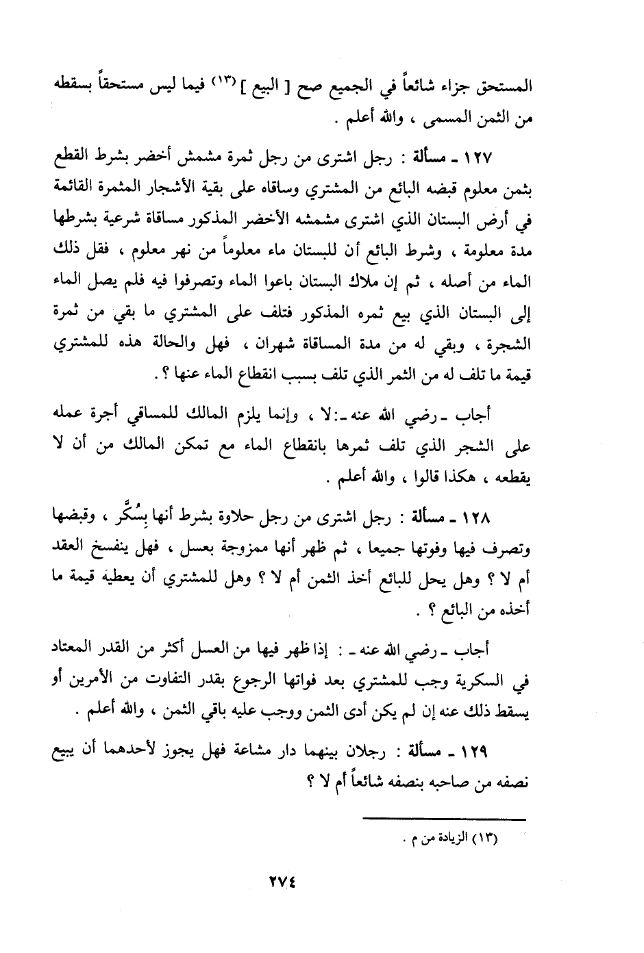 127 - مَسْأَلَة رجل اشْترى من رجل ثَمَرَة مشمش أَخْضَر بِشَرْط الْقطع بِثمن مَعْلُوم قَبضه البَائِع من المُشْتَرِي وساقاه على بَقِيَّة الْأَشْجَار المثمرة الْقَائِمَة فِي أَرض الْبُسْتَان الَّذِي اشْترى مشمشه الْأَخْضَر الْمَذْكُور مُسَاقَاة شَرْعِيَّة بشرطها مُدَّة مَعْلُومَة وَشرط البَائِع أَن للبستان مَاء مَعْلُوما من نهر مَعْلُوم فَقل ذَلِك المَاء من أَصله ثمَّ إِن ملاك الْبُسْتَان باعوا المَاء وتصرفوا فِيهِ فَلم يصل المَاء إِلَى الْبُسْتَان الَّذِي بيع ثمره الْمَذْكُور فَتلف على المُشْتَرِي مَا بَقِي من ثَمَرَة الشَّجَرَة وَبَقِي لَهُ من مُدَّة الْمُسَاقَاة شَهْرَان فَهَل وَالْحَالة هَذِه للْمُشْتَرِي قيمَة مَا تلف لَهُ من الثَّمر الَّذِي تلف بِسَبَب انْقِطَاع المَاء عَنْهَا