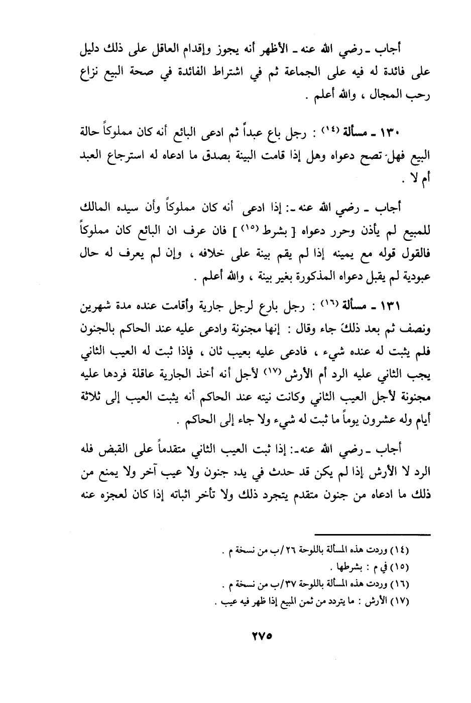131 - مَسْأَلَة رجل بَاعَ لرجل جَارِيَة وأقامت عِنْده مُدَّة شَهْرَيْن وَنصف ثمَّ بعد ذَلِك جَاءَ وَقَالَ إِنَّهَا مَجْنُونَة وَادّعى عَلَيْهِ عِنْد الْحَاكِم بالجنون فَلم يثبت لَهُ عِنْده شَيْء فَادّعى عَلَيْهِ بِعَيْب ثَان فَإِذا ثَبت لَهُ الْعَيْب الثَّانِي يجب الثَّانِي عَلَيْهِ الرَّد أم الْأَرْش لأجل أَنه أَخذ الْجَارِيَة عَاقِلَة فَردهَا عَلَيْهِ مَجْنُونَة لأجل الْعَيْب الثَّانِي وَكَانَت نِيَّته عِنْد الْحَاكِم أَنه يثبت الْعَيْب إِلَى ثَلَاثَة أَيَّام وَله عشرُون يَوْمًا مَا ثَبت لَهُ شَيْء وَلَا جَاءَ إِلَى الْحَاكِم