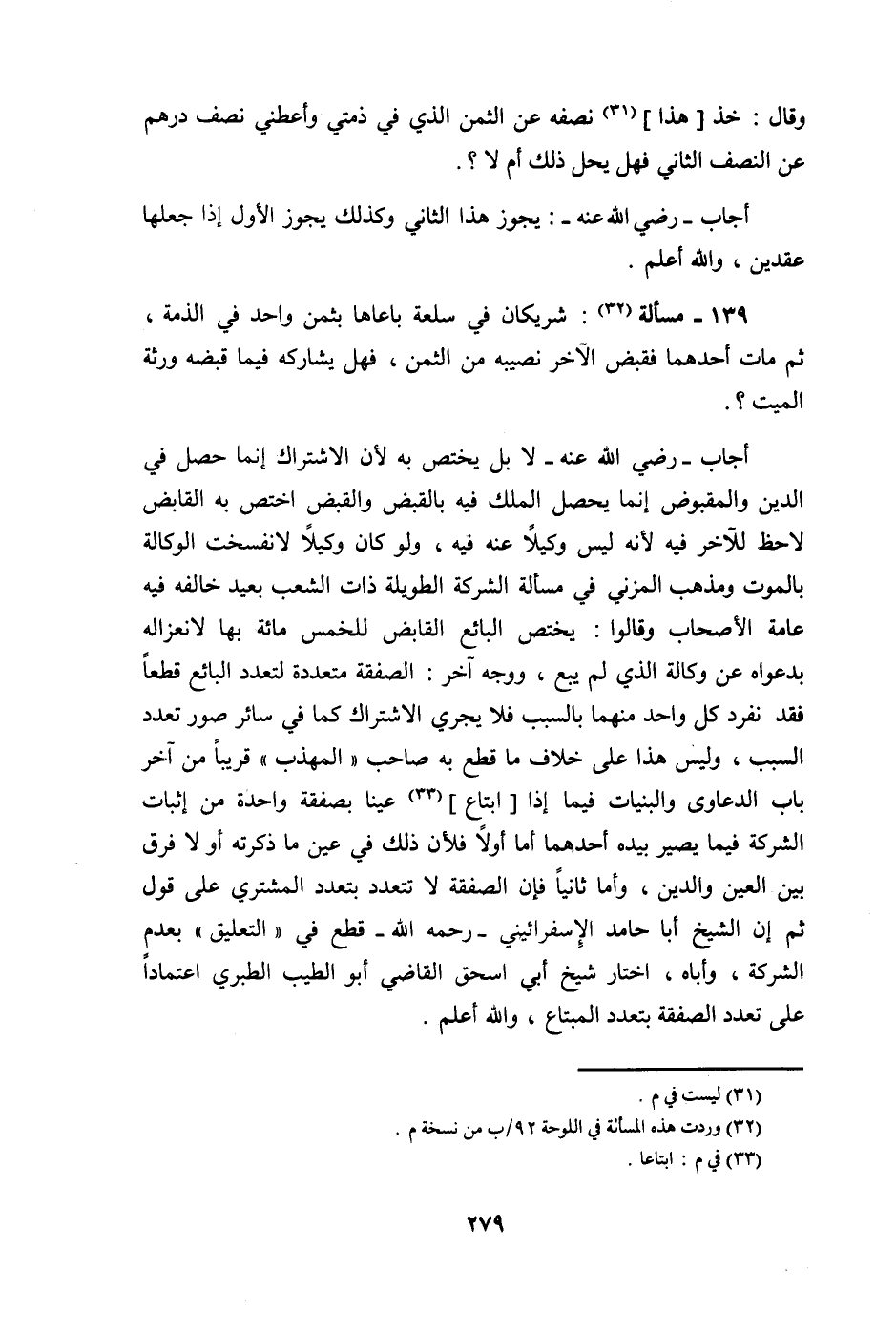 139 - مَسْأَلَة شريكان فِي سلْعَة باعاها بِثمن وَاحِد فِي الذِّمَّة ثمَّ مَاتَ أَحدهمَا فَقبض الآخر نصِيبه من الثّمن فَهَل يُشَارِكهُ فِيمَا قَبضه وَرَثَة الْمَيِّت