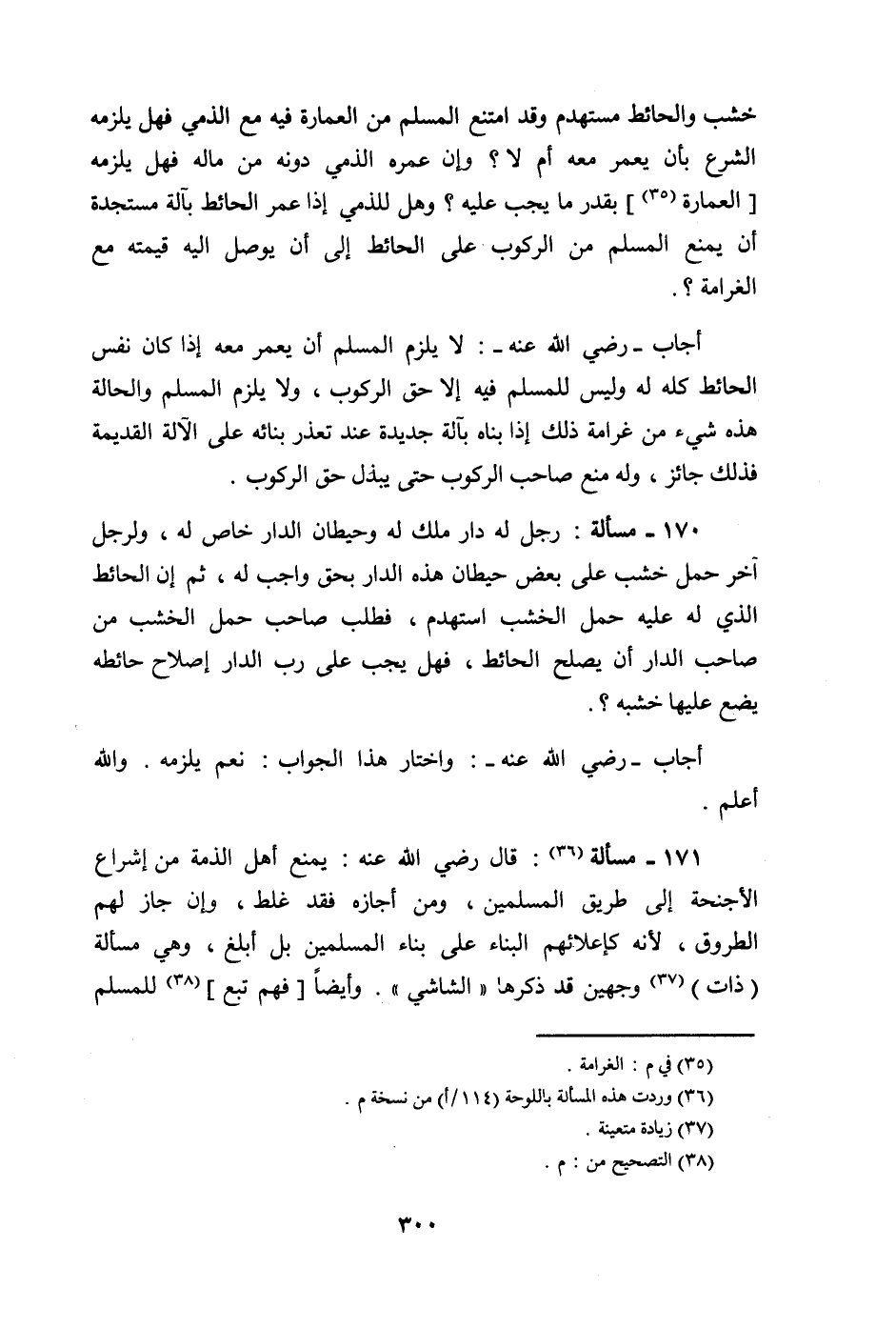أجَاب رَضِي الله عَنهُ لَا يلْزم الْمُسلم أَن يعمر مَعَه إِذا كَانَ نفس الْحَائِط كُله لَهُ وَلَيْسَ للْمُسلمِ فِيهِ إِلَّا حق الرّكُوب وَلَا يلْزم الْمُسلم وَالْحَالة هَذِه شَيْء من غَرَامَة ذَلِك إِذا بناه بِآلَة جَدِيدَة عِنْد تعذر بنائِهِ على الْآلَة الْقَدِيمَة فَذَلِك جَائِز وَله منع صَاحب الرّكُوب حَتَّى يبْذل حق الرّكُوب