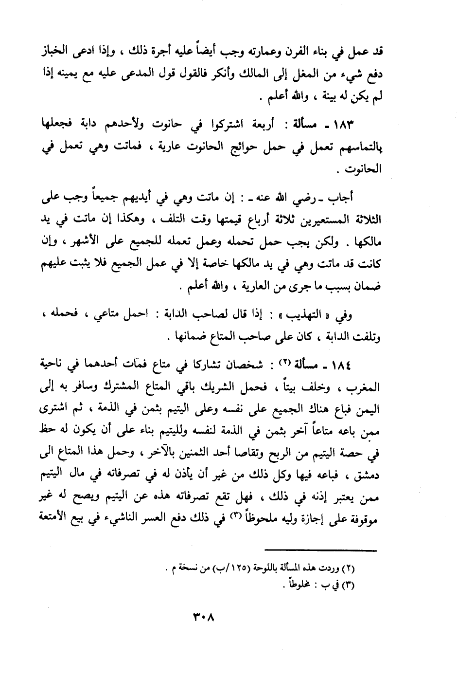 183 - مَسْأَلَة أَرْبَعَة اشْتَركُوا فِي حَانُوت ولأحدهم دَابَّة فَجَعلهَا بالتماسهم تعْمل فِي حمل حوائج الْحَانُوت عَارِية فَمَاتَتْ وَهِي تعْمل فِي الْحَانُوت