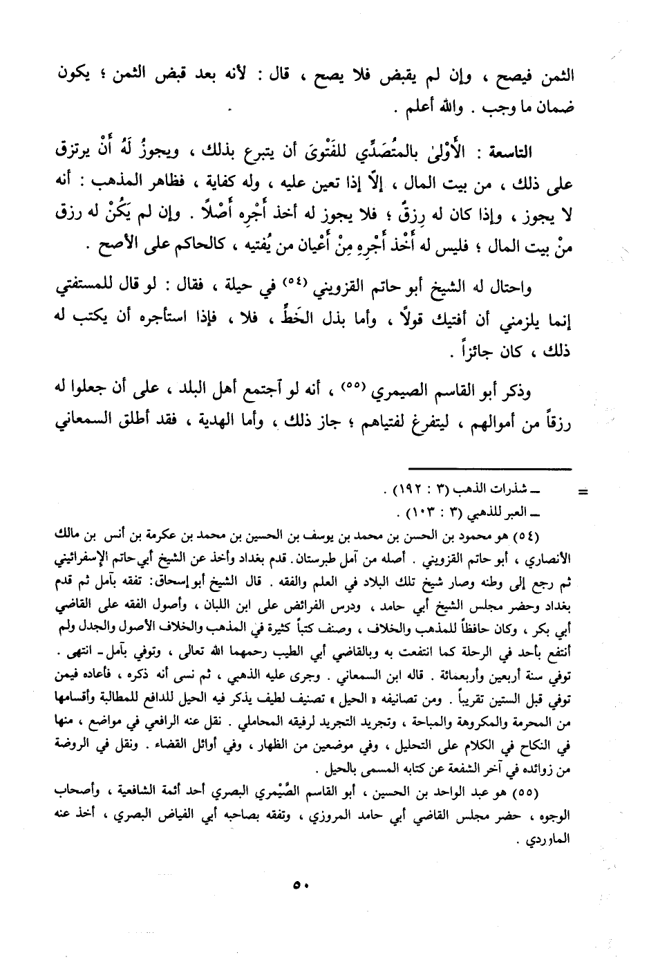 التَّاسِعَة الأولى بالمتصدي للْفَتْوَى أَن يتَبَرَّع بذلك وَيجوز لَهُ أَن يرتزق على ذَلِك من بَيت المَال إِلَّا إِذا تعين عَلَيْهِ وَله كِفَايَة فَظَاهر الْمَذْهَب أَنه لَا يجوز وَإِذا كَانَ لَهُ رزق فَلَا يجوز لَهُ أَخذ أجره أصلا وَإِن لم يكن لَهُ رزق من بَيت المَال فَلَيْسَ لَهُ أَخذ أجره من أَعْيَان من يفتيه كالحاكم على الْأَصَح