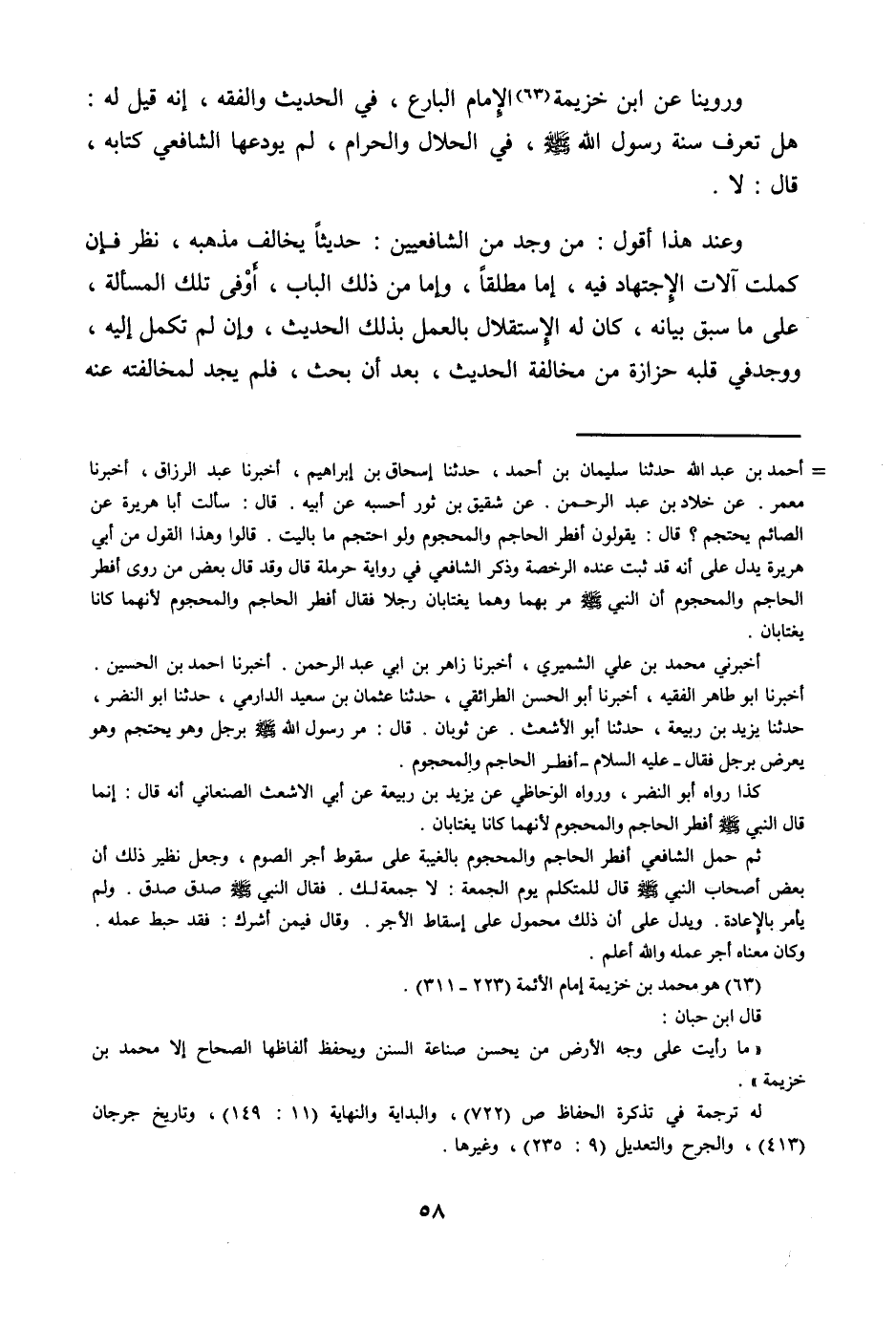 وروينا عَن ابْن خُزَيْمَة الإِمَام البارع فِي الحَدِيث وَالْفِقْه إِنَّه قيل لَهُ هَل تعرف سنة رَسُول الله صلى الله عَلَيْهِ وَسلم فِي الْحَلَال وَالْحرَام لم يودعها الشَّافِعِي كِتَابه قَالَ لَا