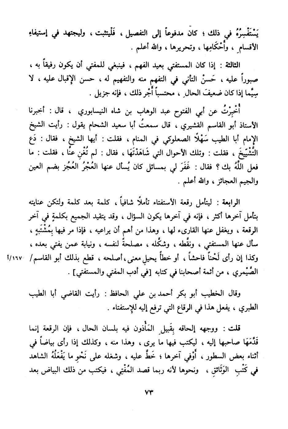 الرَّابِعَة ليتأمل رقْعَة الأستفتاء تأملا شافيا كلمة بعد كلمة ولتكن عنايته بتأمل آخرهَا أَكثر فَإِنَّهُ فِي آخرهَا يكون السُّؤَال وَقد يتَقَيَّد الْجَمِيع بِكَلِمَة فِي آخر الرقعة ويغفل عَنْهَا القارىء لَهَا وَهَذَا من أهم أَن يراعيه فَإِذا مر فِيهَا بمشتبه سَأَلَ عَنْهَا المستفتي ونقطه وشكله مصلحَة لنَفسِهِ ونيابة عَمَّن يُفْتِي بعده وَكَذَا إِن رأى لحنا فَاحِشا أَو خطأ يحِيل معنى أصلحه قطع بذلك أَبُو الْقَاسِم الصَّيْمَرِيّ من أَئِمَّة أَصْحَابنَا فِي كِتَابه فِي أدب الْمُفْتِي والمستفتي