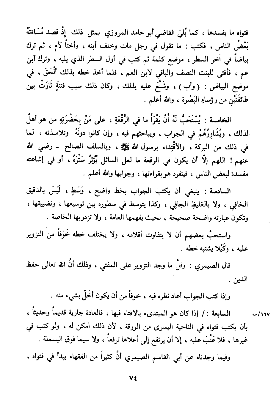 السَّابِعَة إِذا كَانَ هُوَ المبتدىء بالإفتاء فِيهَا العاده جَارِيَة قَدِيما وحديثا بِأَن يكْتب فتواه فِي النَّاحِيَة الْيُسْرَى من الورقة لِأَن ذَلِك أمكن لَهُ وَلَو كتب فِي غَيرهَا فَلَا عتب عَلَيْهِ إِلَّا أَن يرْتَفع إِلَى أَعْلَاهَا ترفعا وَلَا سِيمَا فَوق الْبَسْمَلَة