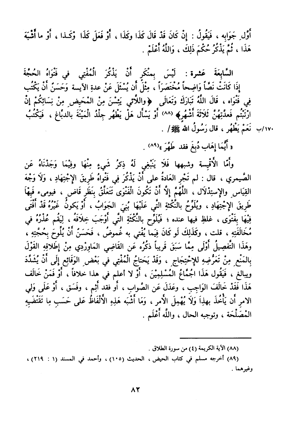 السَّابِعَة عشرَة لَيْسَ بمنكر أَن يذكر الْمُفْتِي فِي فتواه الْحجَّة إِذا كَانَت نصا وَاضحا مُخْتَصرا مثل أَن يسئل عَن عدَّة الْآيَة وَحسن أَن يكْتب فِي فتواه قَالَ الله تبَارك وَتَعَالَى {واللائي يئسن من الْمَحِيض من نِسَائِكُم إِن ارتبتم فعدتهن ثَلَاثَة أشهر} أَو يسْأَل هَل يطهر جلد الْميتَة بالدباغ فَيكْتب نعم يطهر قَالَ رَسُول الله صلى الله عَلَيْهِ وَسلم