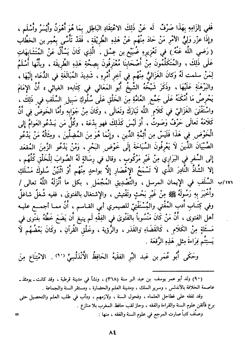 @ فَفِي إِلْزَامه بِهَذَا صرف لَهُ عَن ذَلِك الِاعْتِقَاد الْبَاطِل بِمَا هُوَ أَهْون وأيسر وَأسلم وَإِذا عزّر ولي الْأَمر من حاد مِنْهُم عَن هَذِه الطَّرِيقَة فقد تأسى بعمر بن الْخطاب رَضِي الله عَنهُ فِي تعزيره ضبيع بن عسل الَّذِي كَانَ يسْأَل عَن المتشابهات على ذَلِك والمتكلمون من أَصْحَابنَا معترفون بِصِحَّة هَذِه الطَّرِيقَة وبأنها أسلم لمن سلمت لَهُ وَكَانَ الْغَزالِيّ مِنْهُم فِي آخر أمره شَدِيد الْمُبَالغَة فِي الدُّعَاء إِلَيْهَا والبرهنة عَلَيْهَا وَذكر شَيْخه الشَّيْخ أَبُو الْمَعَالِي فِي كِتَابه الغياثي أَن الإِمَام يحرص مَا أمكنه على جمع الْعَامَّة من الْخلق على سلوك سَبِيل السّلف فِي ذَلِك واستفتى الْغَزالِيّ فِي كَلَام الله تبَارك وَتَعَالَى وَكَانَ من جَوَابه وَأما الْخَوْض فِي أَن كَلَامه تَعَالَى حرف وَصَوت أَو لَيْسَ كَذَلِك فَهُوَ بِدعَة وكل من يَدْعُو الْعَوام إِلَى الْخَوْض فِي هَذَا فَلَيْسَ من أَئِمَّة الدّين وَإِنَّمَا هُوَ من المضلين ومثاله من يَدْعُو الصّبيان الَّذين لَا يعْرفُونَ السباحة إِلَى خوض الْبَحْر وَمن يَدْعُو الزَّمن المقعد إِلَى السّفر فِي البراري من غير مركوب وَقَالَ فِي رِسَالَة لَهُ الصَّوَاب لِلْخلقِ كلهم إِلَّا الشاذ النَّادِر الَّذِي لَا تسمح الإعصار إِلَّا بِوَاحِد مِنْهُم أَو اثْنَيْنِ سلوك مَسْلَك السّلف فِي الْإِيمَان الْمُرْسل والتصديق الْمُجْمل بِكُل مَا أنزلهُ الله تَعَالَى وَأخْبر بِهِ رَسُوله صلى الله عَلَيْهِ وَسلم من غير بحث وتفتيش والإشتغال بالفتوى فَفِيهِ شغل شاغل وَفِي كتاب أدب الْمُفْتِي والمستفتي للصيمري أبي الْقَاسِم أَن مِمَّا أجمع عَلَيْهِ أهل الْفَتْوَى أَن من كَانَ مَنْسُوبا بالفتوى فِي الْفِقْه لم يَنْبغ أَن يضع حَظه بفتوى فِي مسئلة من الْكَلَام كالقضاء وَالْقدر والرؤية وَخلق الْقُرْآن وَكَانَ بَعضهم لَا يستتم قِرَاءَة مثل هَذِه الرقعة