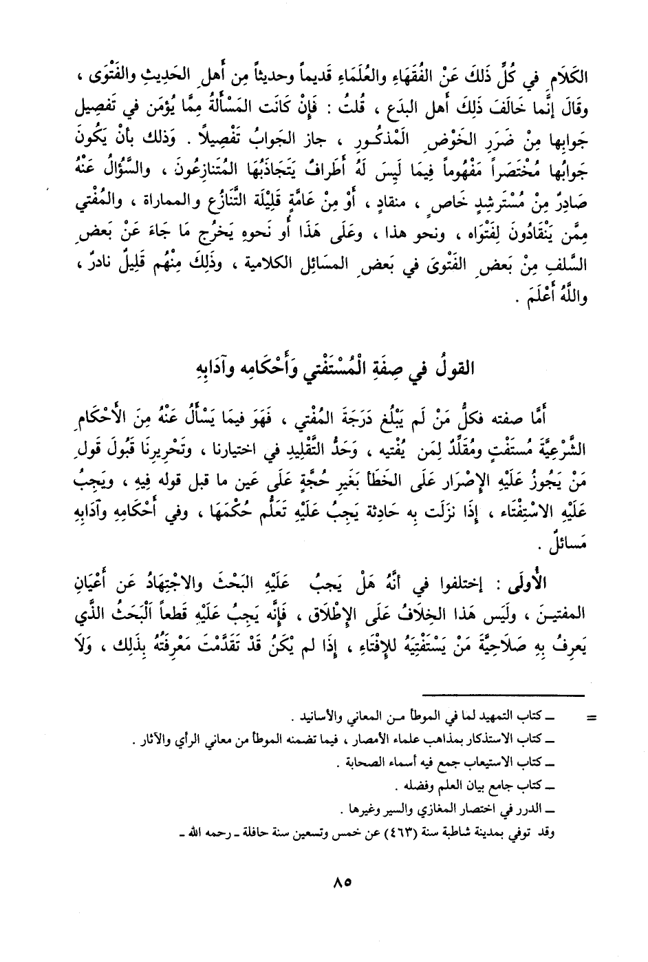 @ الْكَلَام فِي كل ذَلِك عَن الْفُقَهَاء وَالْعُلَمَاء قَدِيما وحديثا من أهل الحَدِيث وَالْفَتْوَى وَقَالَ إِنَّمَا خَالف ذَلِك أهل الْبدع قلت فَإِن كَانَت الْمَسْأَلَة مِمَّا يُؤمن فِي تَفْصِيل جوابها من ضَرَر الْخَوْض الْمَذْكُور جَازَ الْجَواب تَفْصِيلًا وَذَلِكَ بِأَن يكون جوابها مُخْتَصرا مفهوما فِيمَا لَيْسَ لَهُ أَطْرَاف يتجاذبها المتنازعون وَالسُّؤَال عَنهُ صادر من مسترشد خَاص منقاد أَو من عَامَّة قَليلَة التَّنَازُع والمماراة والمفتي مِمَّن ينقادون لفتواه وَنَحْو هَذَا وعَلى هَذَا أَو نَحوه يخرج مَا جَاءَ عَن بعض السّلف من بعض الْفَتْوَى فِي بعض الْمسَائِل الكلامية وَذَلِكَ مِنْهُم قَلِيل نَادِر وَالله أعلم