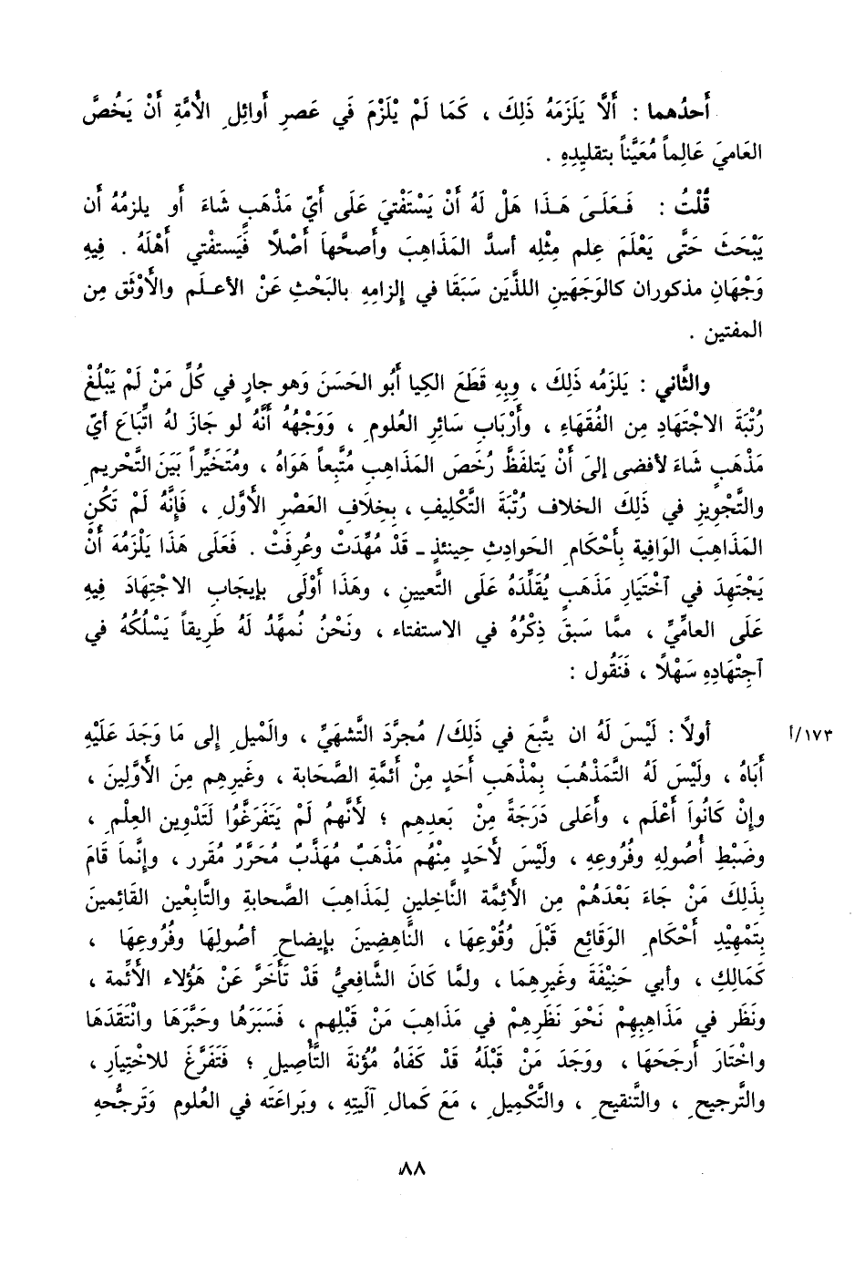 أَولا لَيْسَ لَهُ أَن يتبع فِي ذَلِك مُجَرّد التشهي والميل إِلَى مَا وجد عَلَيْهِ أَبَاهُ وَلَيْسَ لَهُ التمذهب بِمذهب أحد من أَئِمَّة الصَّحَابَة وَغَيرهم من الْأَوَّلين وَإِن كَانُوا أعلم وَأَعْلَى دَرَجَة من بعدهمْ لأَنهم لم يتفرغوا لتدوين الْعلم وَضبط أُصُوله وفروعه وَلَيْسَ لأحد مِنْهُم مَذْهَب مهذب مُحَرر مُقَرر وَإِنَّمَا قَامَ بذلك من جَاءَ بعدهمْ من الْأَئِمَّة الناخلين لمذاهب الصَّحَابَة وَالتَّابِعِينَ القائمين بتمهيد أَحْكَام الوقائع قبل وُقُوعهَا الناهضين بإيضاح أُصُولهَا وفروعها كمالك وَأبي حنيفَة وَغَيرهمَا وَلما كَانَ الشَّافِعِي قد تَأَخّر عَن هَؤُلَاءِ الْأَئِمَّة وَنظر فِي مذاهبهم نَحْو نظرهم فِي مَذَاهِب من قبلهم فسبرها وحبرها وانتقدها وَاخْتَارَ أرجحها وَوجد من قبله قد كَفاهُ مُؤنَة التأصيل فتفرغ للاختيار وَالتَّرْجِيح والتنقيح والتكميل مَعَ كَمَال آليته وبراعته فِي الْعُلُوم وترجحه