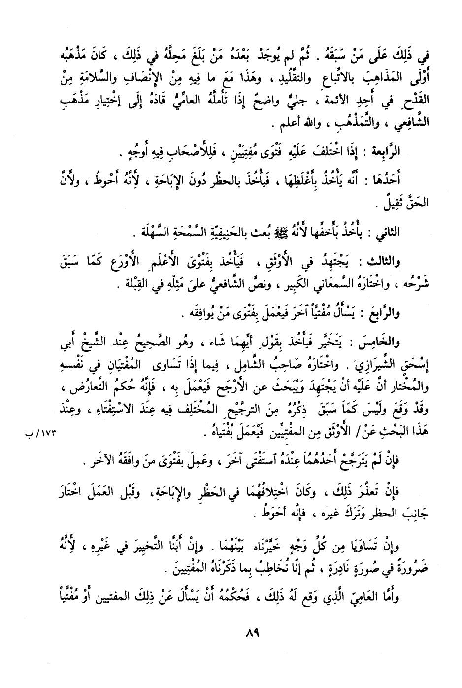 وَالْخَامِس يتَخَيَّر فَيَأْخُذ بقول أَيهمَا شَاءَ وَهُوَ الصَّحِيح عِنْد الشَّيْخ أبي إِسْحَق الشِّيرَازِيّ وَاخْتَارَهُ صَاحب الشَّامِل فِيمَا إِذا تساوى المفتيان فِي نَفسه وَالْمُخْتَار أَن عَلَيْهِ أَن يجْتَهد ويبحث عَن الْأَرْجَح فَيعْمل بِهِ فَإِنَّهُ حكم التَّعَارُض وَقد وَقع وَلَيْسَ كَمَا سبق ذكره من التَّرْجِيح الْمُخْتَلف فِيهِ عِنْد الاستفتاء وَعند هَذَا الْبَحْث عَن الأوثق من المفتيين فَيعْمل بفتياه