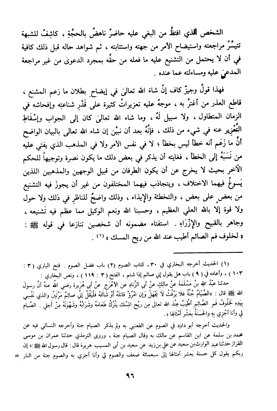 فَهَذَا قَول وجيز كَاف إِن شَاءَ الله تَعَالَى فِي إِيضَاح بطلَان مَا زعم المشنع قَاطع الْعذر من آغتر بِهِ موجه عَلَيْهِ تعزيزات كَثِيرَة على قدر شناعته وإفحاشه فِي الزَّمَان المتطاول وَلَا سَبِيل لَهُ وَمَا شَاءَ الله تَعَالَى كَانَ إِلَى الْجَواب وَإِسْقَاط التَّعْزِير عَنهُ فِي شَيْء من ذَلِك فَإِنَّهُ بعد أَن نبين إِن شَاءَ الله تَعَالَى بِالْبَيَانِ الْوَاضِح أَن مَا زعم أَنه خطأ لَيْسَ بخطأ لَا فِي نفس الْأَمر وَلَا فِي الْمَذْهَب الَّذِي يُفْتِي عَلَيْهِ من نسبه إِلَى الْخَطَأ فغايته أَن يذكر فِي بعض ذَلِك مَا يكون نصْرَة وتوجيها للْحكم الآخر بِحَيْثُ لَا يخرج عَن أَن يكون الطرفان من قبيل الْوَجْهَيْنِ والمذهبين اللَّذين يسوغ فيهمَا الِاخْتِلَاف ويتجاذب فيهمَا المختلفون من غير أَن يجوز فِيهِ التشنيع من بعض على بعض والتخطئة والإيذاء وَذَلِكَ وَاضح للنَّاظِر فِي ذَلِك وَلَا حول وَلَا قُوَّة إِلَّا بِاللَّه الْعلي الْعَظِيم وحسبنا الله وَنعم الْوَكِيل مِمَّا عظم فِيهِ تشنيعه وجاهر بالقبيح والإزراء استفتاء مضمونه أَن شَخْصَيْنِ تنَازعا فِي قَوْله صلى الله عَلَيْهِ وَسلم لخلوف فَم الصَّائِم أطيب عِنْد الله من ريح الْمسك