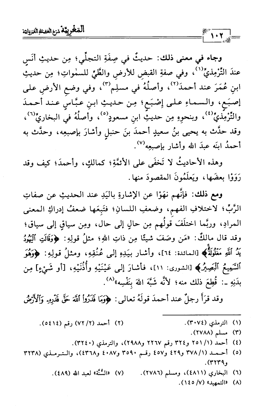 وجاء في معنى ذلك: حديثٌ في صِفَةِ التجلِّي؛ مِن حديثِ أنَسٍ عندَ التِّرْمِذيِّ (١)، وفي صفةِ القبضِ للأرضِ والطَّيِّ للسمواتِ؛ مِن حديثِ ابنِ عُمَرَ عند أحمدَ (٢)، وأصلُهُ في مسلِم (٣)، وفي وضعِ الأرضِ على إصبَعٍ، والسماءِ على إِصْبَعٍ؛ مِن حديثِ ابنِ عبَّاسٍ عند أحمدَ والتِّرْمِذيِّ (٤)، وبنحوِهِ مِن حديثِ ابنِ مسعودٍ (٥)، وأصلُهُ في البخاريِّ (٦)، وقد حدَّث به يحيى بنُ سعيدٍ أحمدَ بنَ حنبلٍ وأشارَ بإصبعِه، وحدَّث به أحمدُ ابنَه عبدَ الله وأشار بإصبعِه (٧).