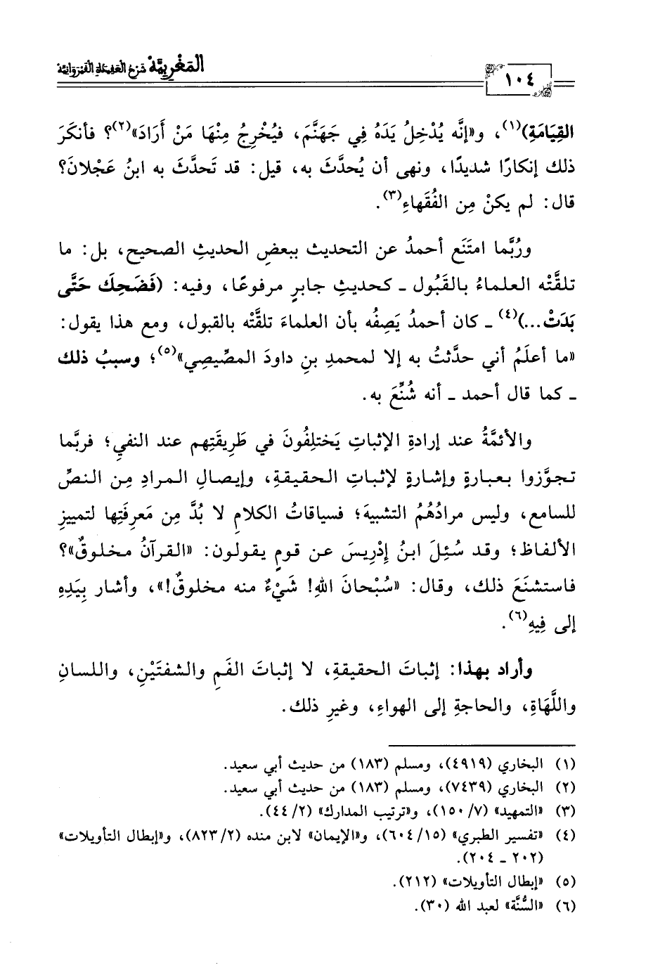 والأئمَّةُ عند إرادةِ الإثباتِ يَختلِفُونَ في طَرِيقَتِهم عند النفيِ؛ فربَّما تجوَّزوا بعبارةٍ وإشارةٍ لإثباتِ الحقيقةِ، وإيصالِ المرادِ مِن النصِّ للسامع، وليس مرادُهُمُ التشبيهَ؛ فسياقاتُ الكلامِ لا بُدَّ مِن مَعرِفَتِها لتمييزِ الألفاظ؛ وقد سُئِلَ ابنُ إِدْرِيسَ عن قومٍ يقولون: "القرآنُ مخلوقٌ"؟ فاستشنَعَ ذلك، وقال: "سُبْحانَ اللهِ! شَيْءٌ منه مخلوقٌ! "، وأشار بِيَدِهِ إلى فِيهِ (٦).
