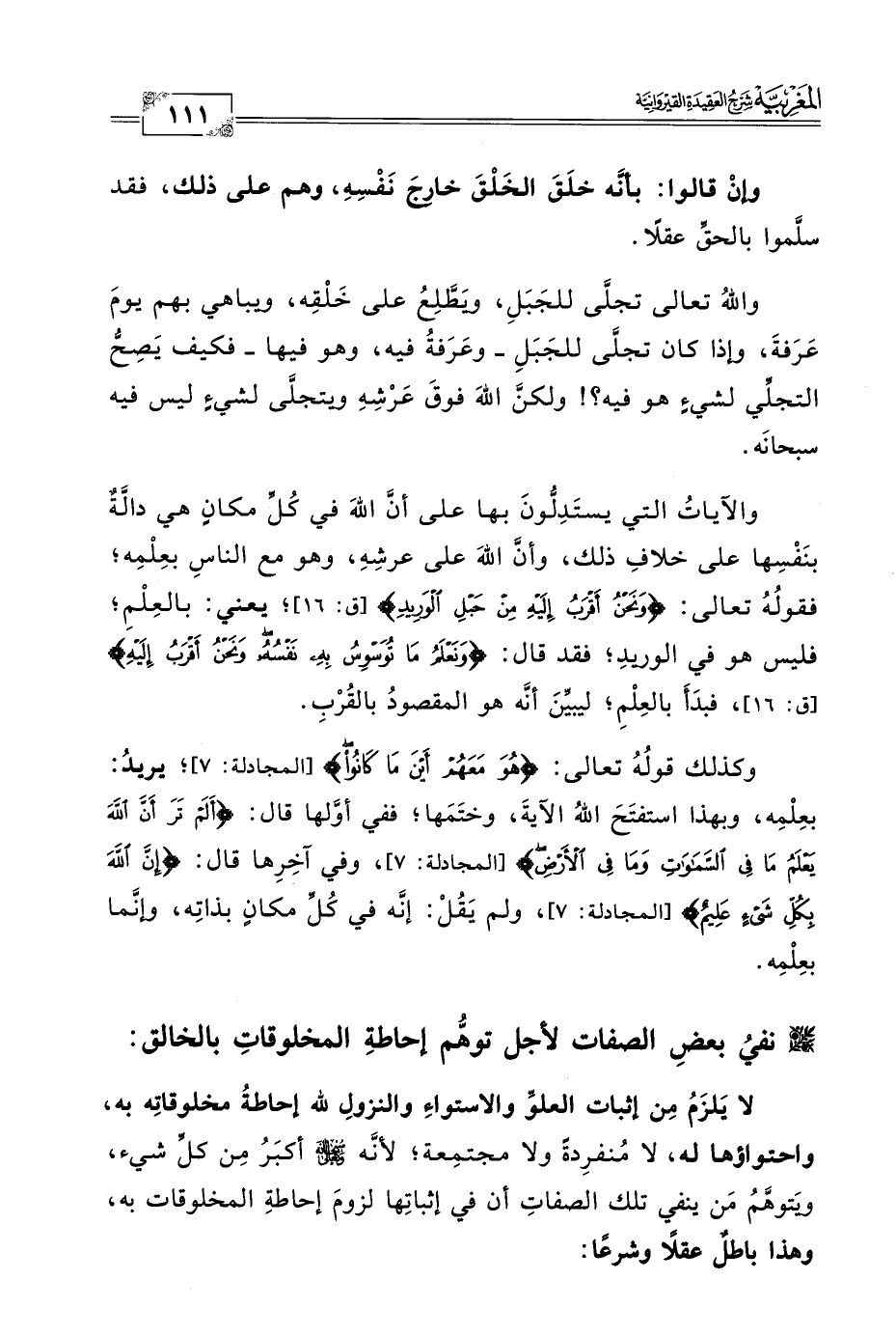 وكذلك قولُهُ تعالى: {هُوَ مَعَهُمْ أَيْنَ مَا كَانُوا} [المجادلة: ٧]؛ يريدُ: بعِلْمِه، وبهذا استفتَحَ اللهُ الآيةَ، وختَمَها؛ ففي أوَّلها قال: {أَلَمْ تَرَ أَنَّ اللَّهَ يَعْلَمُ مَا فِي السَّمَاوَاتِ وَمَا فِي الْأَرْضِ} [المجادلة: ٧]، وفي آخِرِها قال: {إِنَّ اللَّهَ بِكُلِّ شَيْءٍ عَلِيمٌ} [المجادلة: ٧]، ولم يَقُلْ: إنَّه في كُلِّ مكانٍ بذاتِه، وإنَّما بعِلْمِه.