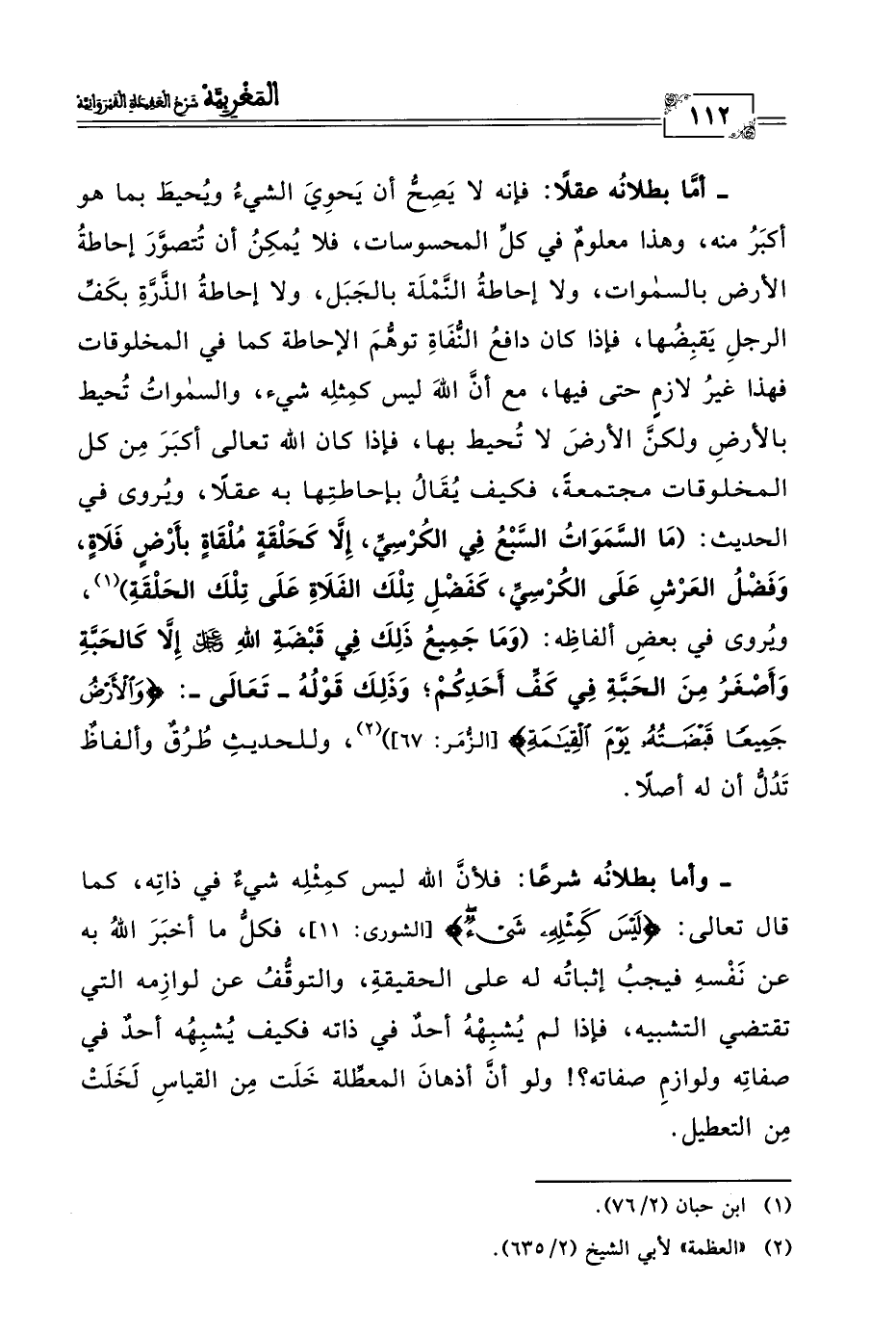 - أمَّا بطلانُه عقلًا: فإنه لا يَصِحُّ أن يَحوِيَ الشيءُ ويُحيطَ بما هو أكبَرُ منه، وهذا معلومٌ في كلِّ المحسوسات، فلا يُمكِنُ أن تُتصوَّرَ إحاطةُ الأرض بالسموات، ولا إحاطةُ النَّمْلَة بالجَبَل، ولا إحاطةُ الذَّرَّةِ بكَفِّ الرجلِ يَقبِضُها، فإذا كان دافعُ النُّفَاةِ توهُّمَ الإحاطة كما في المخلوقات فهذا غيرُ لازمٍ حتى فيها، مع أنَّ اللهَ ليس كمِثلِه شيء، والسمواتُ تُحيط بالأرضِ ولكنَّ الأرضَ لا تُحيط بها، فإذا كان الله تعالى أكبَرَ مِن كل المخلوقات مجتمعةً، فكيف يُقَالُ بإحاطتِها به عقلًا، ويُروى في الحديث: (مَا السَّمَوَاتُ السَّبْعُ فِي الكُرْسِيِّ، إلَّا كَحَلْقَةٍ مُلْقَاةٍ بأَرْضٍ فَلَاةٍ، وَفَضْلُ العَرْشِ عَلَى الكُرْسِيِّ، كَفَضْلِ تِلْكَ الفَلَاةِ عَلَى تِلْكَ الحَلْقَةِ) (١)، ويُروى في بعضِ ألفاظِه: (وَمَا جَمِيعُ ذَلِكَ فِي قَبْضَةِ اللهِ -عز وجل- إِلَّا كَالحَبَّةِ وَأَصْغَرُ مِنَ الحَبَّةِ فِي كَفِّ أَحَدِكُمْ؛ وَذَلِكَ قَوْلُهُ -تَعَالَى-: {وَالْأَرْضُ جَمِيعًا قَبْضَتُهُ يَوْمَ الْقِيَامَةِ} [الزُّمَر: ٦٧]) (٢)، وللحديثِ طُرُقٌ وألفاظٌ تَدُلُّ أن له أصلًا.