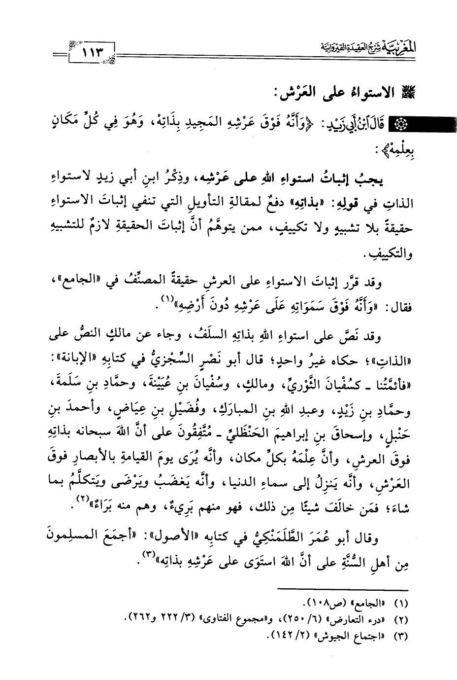 يجبُ إثباتُ استواءِ اللهِ على عَرْشِه، وذِكْرُ ابنِ أبي زيدٍ لاستواءِ الذاتِ في قولِهِ: "بذاتِهِ" دفعٌ لمقالةِ التأويلِ التي تنفي إثباتَ الاستواءِ حقيقةً بلا تشبيهٍ ولا تكييفٍ، ممن يتوهَّمُ أنَّ إثباتَ الحقيقةِ لازمٌ للتشبيهِ والتكييفِ.