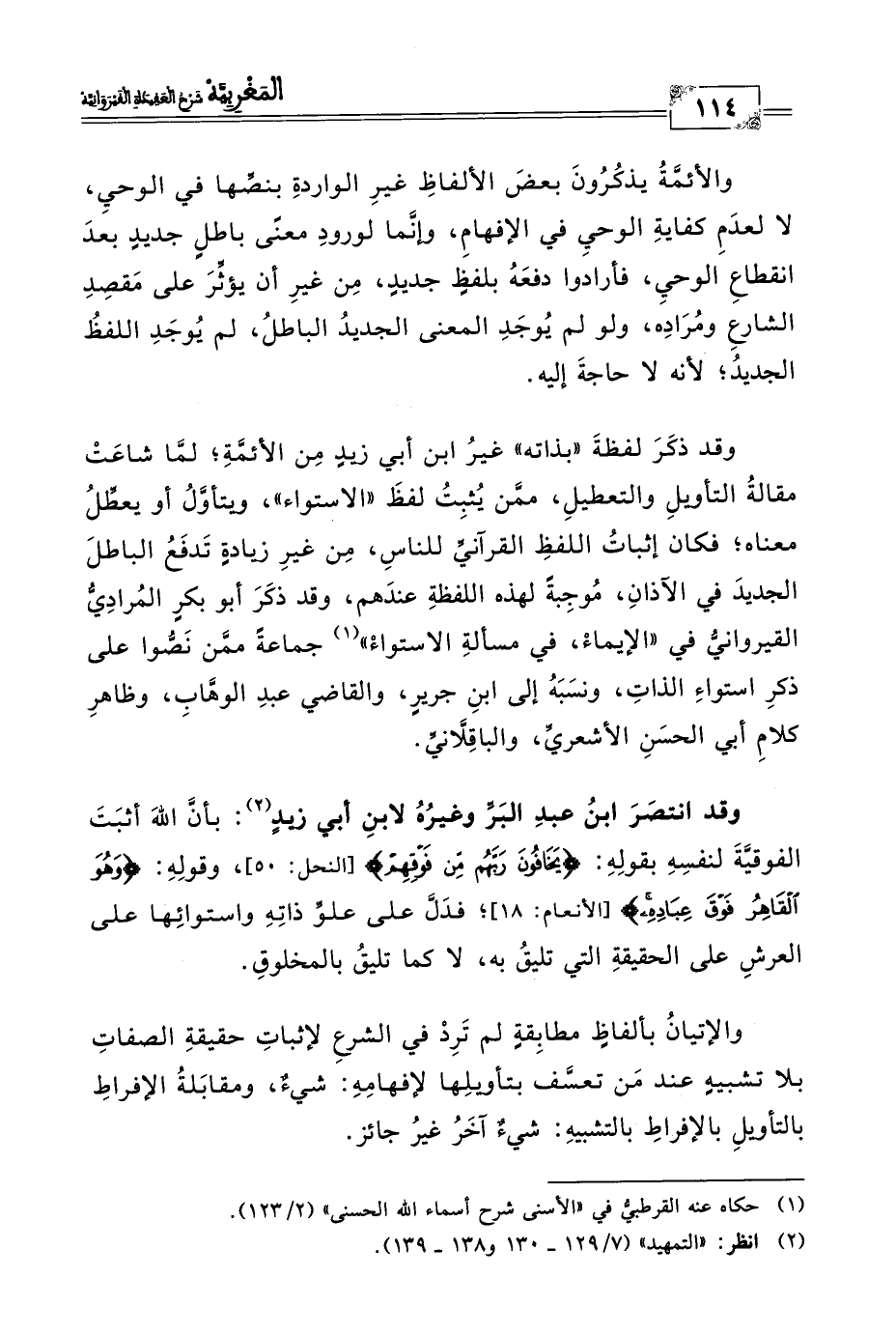وقد انتصَرَ ابنُ عبد البَرِّ وغيرُهُ لابنِ أبي زيدٍ (٢): بأنَّ اللهَ أثبَتَ الفوقيَّةَ لنفسِهِ بقولِهِ: {يَخَافُونَ رَبَّهُمْ مِنْ فَوْقِهِمْ} [النحل: ٥٠]، وقولِهِ: {وَهُوَ الْقَاهِرُ فَوْقَ عِبَادِهِ} [الأنعام: ١٨]؛ فدَلَّ على علوِّ ذاتِهِ واستوائِها على العرشِ على الحقيقةِ التي تليقُ به، لا كما تليقُ بالمخلوقِ.