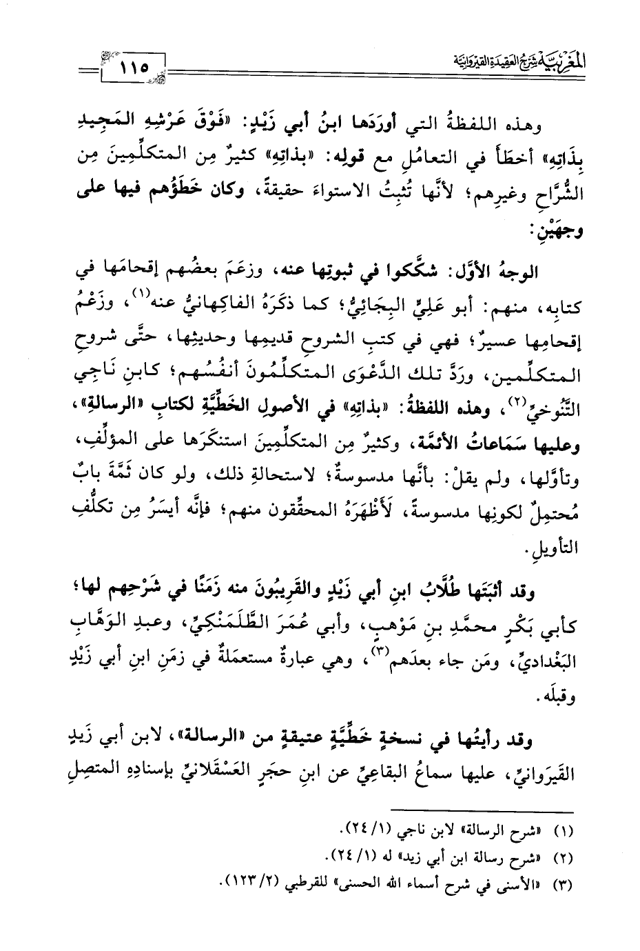 وهذه اللفظةُ التي أورَدَها ابنُ أبي زَيْدٍ: "فَوْقَ عَرْشِهِ المَجِيدِ بِذَاتِهِ" أخطَأَ في التعامُلِ مع قولِه: "بذاتِهِ" كثيرٌ مِن المتكلِّمِينَ مِن الشُّرَّاحِ وغيرِهم؛ لأنَّها تُثبِتُ الاستواءَ حقيقةً، وكان خَطَؤُهم فيها على وجهَيْنِ: