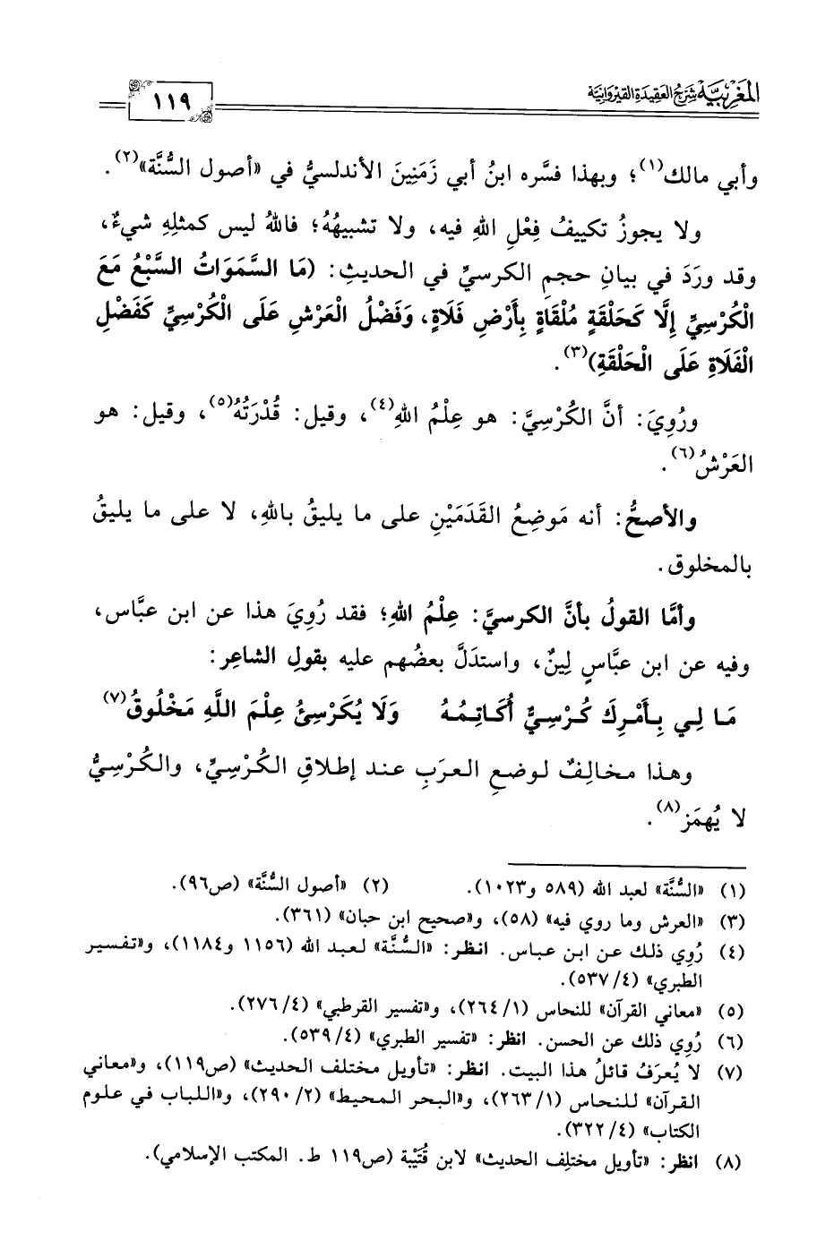 ولا يجوزُ تكييفُ فِعْلِ اللهِ فيه، ولا تشبيهُهُ؛ فاللهُ ليس كمثلِهِ شيءٌ، وقد ورَدَ في بيانِ حجمِ الكرسيِّ في الحديثِ: (مَا السَّمَوَاتُ السَّبْعُ مَعَ الْكُرْسِيِّ إِلَّا كَحَلْقَةٍ مُلْقَاةٍ بِأَرْضِ فَلاةٍ، وَفَضْلُ الْعَرْشِ عَلَى الْكُرْسِيِّ كَفَضْلِ الْفَلاةِ عَلَى الْحَلْقَةِ) (٣).