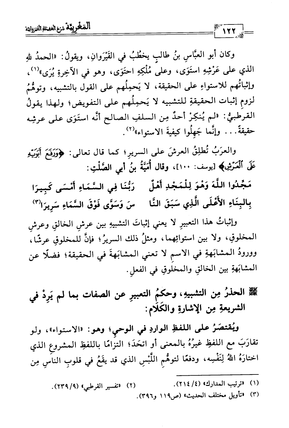 وكان أبو العبَّاسِ بن طالبٍ يخطُبُ في القَيْرَوان، ويقولُ: "الحمدُ للهِ الذي على عَرْشِهِ استَوَى، وعلى مُلْكِهِ احتَوَى، وهو في الآخِرةِ يُرَى" (١)، وإثباتُهم للاستواءِ على الحقيقة، لا يَحمِلُهم على القول بالتشبيه، وتوهُّمُ لزومِ إثبات الحقيقةِ للتشبيه لا يَحمِلُهم على التفويض؛ ولهذا يقولُ القرطبيُّ: "لم يُنكِرْ أحدٌ مِن السلفِ الصالح أنَّه استَوَى على عرشِه حقيقةً ... وإنَّما جَهِلُوا كيفيةَ الاستواء" (٢).