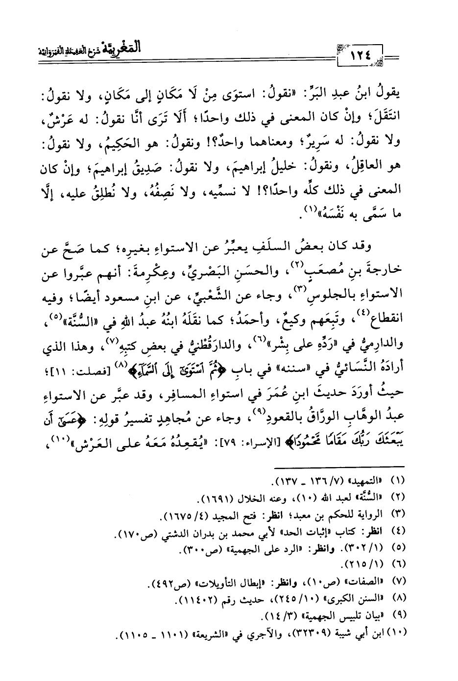 يقولُ ابنُ عبد البَرِّ: "نقولُ: استوَى مِنْ لَا مَكَانٍ إلى مَكَانٍ، ولا نقولُ: انتَقَلَ؛ وإنْ كان المعنى في ذلك واحدًا؛ أَلَا تَرَى أنَّا نقولُ: له عَرْشٌ، ولا نقولُ: له سَرِيرٌ؛ ومعناهما واحدٌ؟ ! ونقولُ: هو الحَكِيمُ، ولا نقولُ: هو العاقِلُ، ونقولُ: خليلُ إبراهيمَ، ولا نقولُ: صَدِيقُ إبراهيمَ؛ وإنْ كان المعنى في ذلك كلِّه واحدًا؟ ! لا نسمِّيه، ولا نَصِفُهُ، ولا نُطلِقُ عليه، إلَّا ما سَمَّى به نَفْسَهُ" (١).
