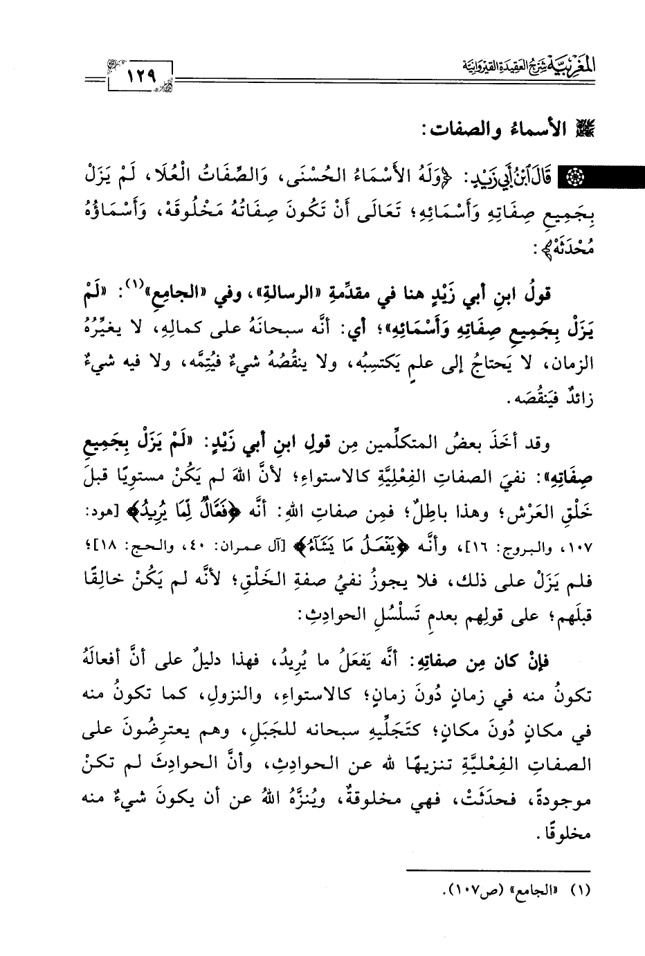 وقد أخَذَ بعضُ المتكلِّمين مِن قولِ ابنِ أبي زَيْدٍ: "لَمْ يَزَلْ بِجَمِيعِ صفَاتِهِ": نفيَ الصفاتِ الفِعْلِيَّةِ كالاستواءِ؛ لأنَّ اللهَ لم يَكُنْ مستوِيًا قبلَ خَلْقِ العَرْش؛ وهذا باطِلٌ؛ فمِن صفاتِ اللهِ: أنَّه {فَعَّالٌ لِمَا يُرِيدُ} [هود: ١٠٧، والبروج: ١٦]، وأنَّه {يَفْعَلُ مَا يَشَاءُ} [آل عمران: ٤٠، والحج: ١٨]؛ فلم يَزَلْ على ذلك، فلا يجوزُ نفيُ صفةِ الخَلْقِ؛ لأنَّه لم يَكُنْ خالِقًا قبلَهم؛ على قولِهم بعدمِ تَسلْسُلِ الحوادِثِ: