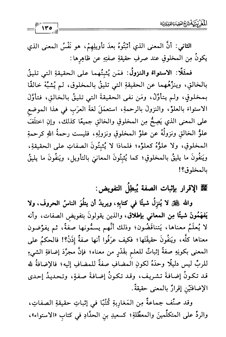 فمثَلًا: الاستواءُ والنزولُ: فمَن يُثبِتُهما على الحقيقةِ التي تليقُ بالخالق، وينزِّهُهما عن الحقيقةِ التي تليقُ بالمخلوق، لم يُشبِّهْ خالقًا بمخلوقٍ، ولم يتأوَّلْ، ومَن نفى الحقيقةَ التي تليقُ بالخالقِ، فتأوَّلَ الاستواءَ بالعلوِّ، والنزولَ بالرحمةِ، استعمَلَ لغةَ العرَبِ في هذا الموضعِ على المعنى الذي يَصِحُّ مِن المخلوقِ والخالقِ جميعًا كذلك، وإنِ اختلَفَ علوُّ الخالقِ ونزولُهُ عن علوِّ المخلوقِ ونزوله، فليست رحمةُ اللهِ كرحمةِ المخلوقِ، ولا علوُّهُ كعلوِّه؛ فلماذا لا يُثبِتُونَ الصفاتِ على الحقيقةِ، ويَنفُونَ ما يليقُ بالمخلوقِ؛ كما يُثبِتُونَ المعانيَ بالتأويل، ويَنفُونَ ما يليقُ بالمخلوق؟ !