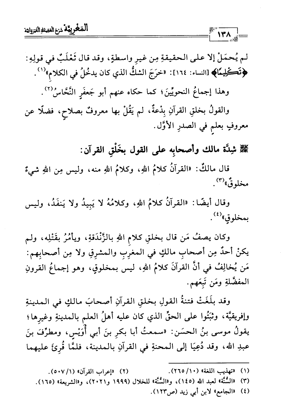 وكان يصفُ مَن قال بخلقِ كلامِ اللهِ بالزَّنْدَقةِ، ويأمُرُ بقَتْلِه، ولم يكنْ أحدٌ مِن أصحابِ مالكٍ في المغرِبِ والمشرِقِ ولا مِن أصحابِهم: مَن يُخالِفُ في أنَّ القرآنَ كلامُ الله، ليس بمخلوقٍ، وهو إجماعُ القرونِ المفضَّلةِ ومَن تَبِعَهم.