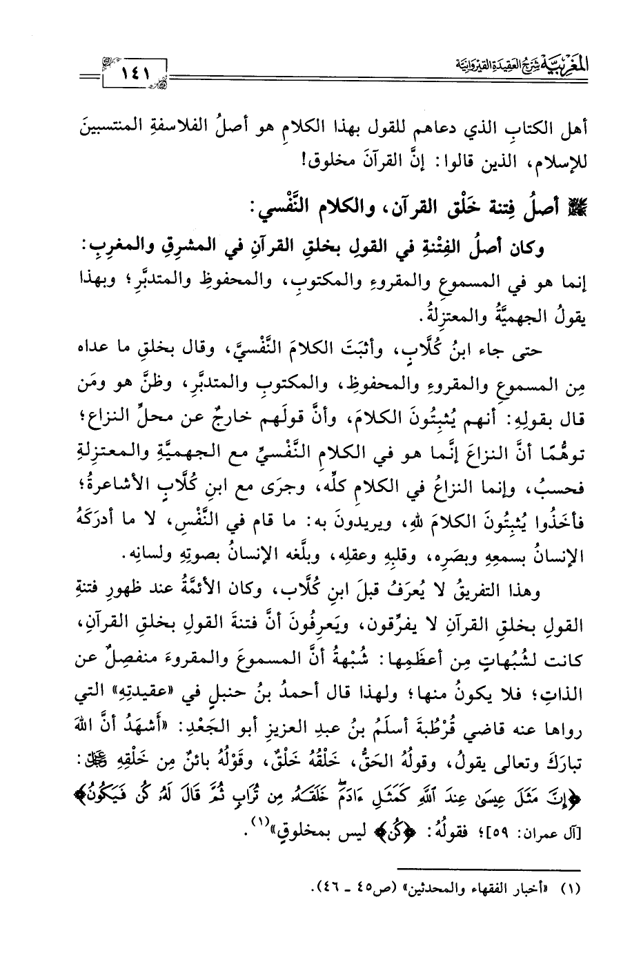 حتى جاء ابنُ كُلَّابٍ، وأثبَتَ الكلامَ النَّفْسيَّ، وقال بخلقِ ما عداه مِن المسموعِ والمقروءِ والمحفوظِ، والمكتوبِ والمتدبَّرِ، وظنَّ هو ومَن قال بقولِهِ: أنهم يُثبِتُونَ الكلامَ، وأنَّ قولَهم خارجٌ عن محلِّ النزاع؛ توهُّمًا أنَّ النزاعَ إنَّما هو في الكلامِ النَّفْسيِّ مع الجهميَّةِ والمعتزِلةِ فحسبُ، وإنما النزاعُ في الكلامِ كلِّه، وجرَى مع ابنِ كُلَّابٍ الأشاعرةُ؛ فأخَذُوا يُثبِتُونَ الكلامَ لله، ويريدونَ به: ما قام في النَّفْسِ، لا ما أدرَكَهُ الإنسانُ بسمعِهِ وبصَرِه، وقلبِهِ وعقلِه، وبلَّغه الإنسانُ بصوتِهِ ولسانِه.