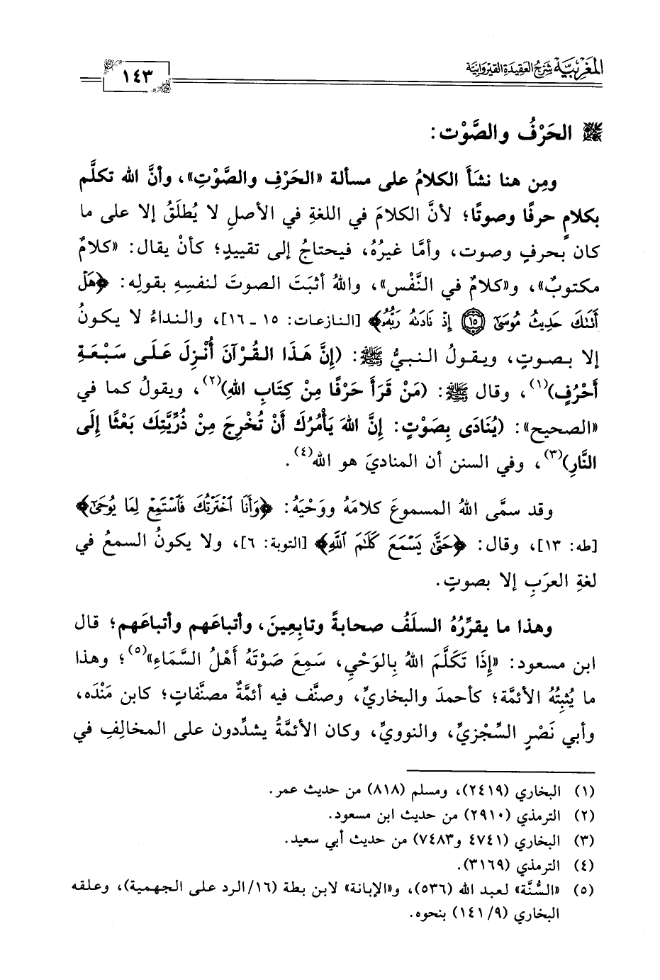 ومِن هنا نشَأ الكلامُ على مسألة "الحَرْفِ والصَّوْتِ"، وأنَّ الله تكلَّم بكلامٍ حرفًا وصوتًا؛ لأنَّ الكلامَ في اللغةِ في الأصلِ لا يُطلَقُ إلا على ما كان بحرفٍ وصوت، وأمَّا غيرُهُ، فيحتاجُ إلى تقييدٍ؛ كأنْ يقال: "كلامٌ مكتوبٌ"، و "كلامٌ في النَّفْس"، واللهُ أثبَتَ الصوتَ لنفسِهِ بقولِه: {هَلْ أَتَاكَ حَدِيثُ مُوسَى (١٥) إِذْ نَادَاهُ رَبُّهُ} [النازعات: ١٥ - ١٦]، والنداءُ لا يكونُ إلا بصوتٍ، ويقولُ النبيُّ -صلى الله عليه وسلم-: (إِنَّ هَذَا القُرْآنَ أُنْزِلَ عَلَى سَبْعَةِ أَحْرُفٍ) (١)، وقال -صلى الله عليه وسلم-: (مَنْ قَرَأَ حَرْفًا مِنْ كِتَابِ اللهِ) (٢)، ويقولُ كما في "الصحيح": (يُنَادَى بِصَوْتٍ: إِنَّ اللهَ يَأْمُرُكَ أَنْ تُخْرِجَ مِنْ ذُرَّيتِكَ بَعْثًا إِلَى النَّارِ) (٣)، وفي السنن أن المناديَ هو الله (٤).