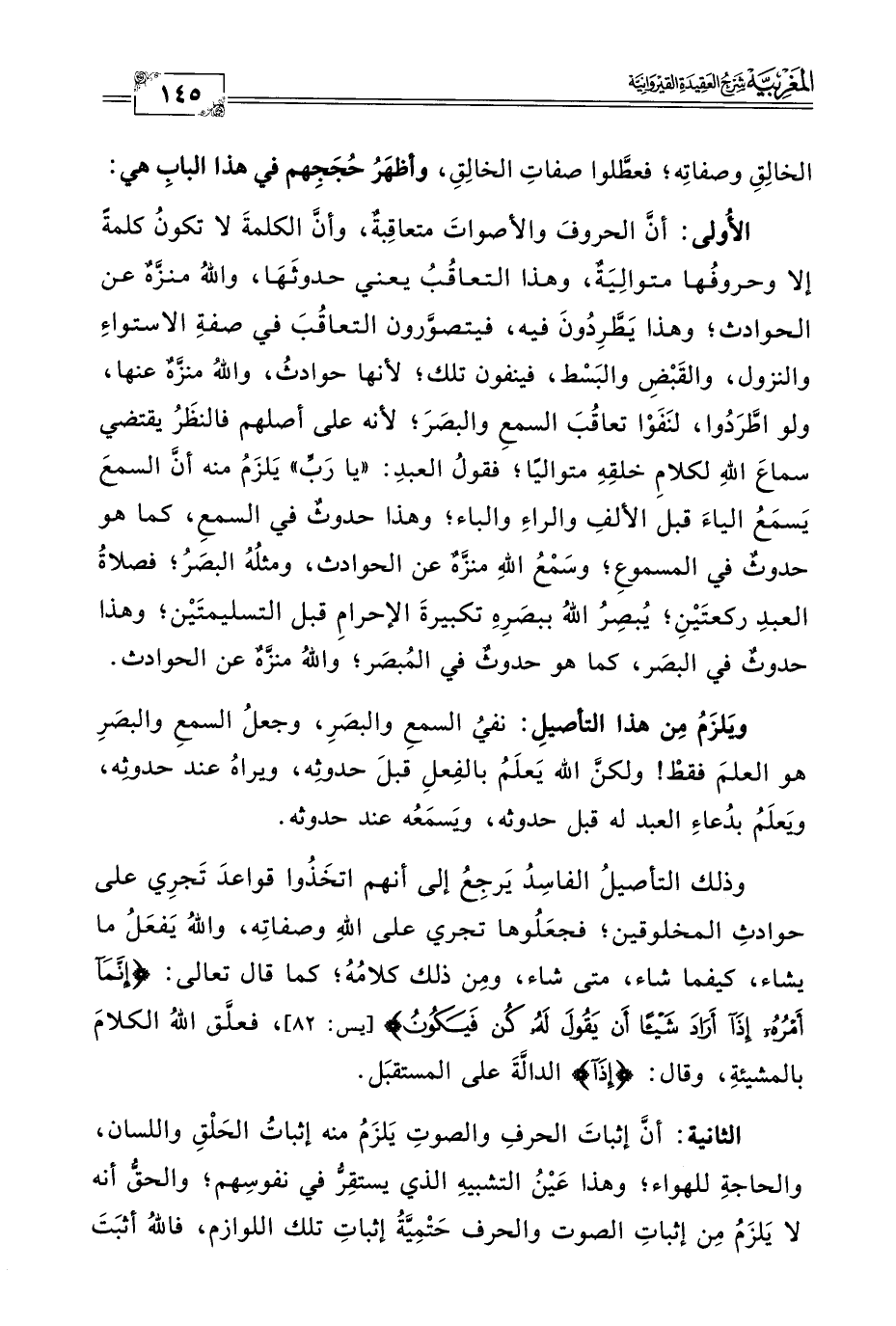 الأُولى: أنَّ الحروفَ والأصواتَ متعاقِبةٌ، وأنَّ الكلمةَ لا تكونُ كلمةً إلا وحروفُها متوالِيَةٌ، وهذا التعاقُبُ يعني حدوثَهَا، واللهُ منزَّهٌ عن الحوادث؛ وهذا يَطَّرِدُونَ فيه، فيتصوَّرون التعاقُبَ في صفةِ الاستواءِ والنزول، والقَبْضِ والبَسْط، فينفون تلك؛ لأنها حوادثُ، واللهُ منزَّهٌ عنها، ولو اطَّرَدُوا، لنَفَوْا تعاقُبَ السمعِ والبصَرَ؛ لأنه على أصلهم فالنظَرُ يقتضي سماعَ اللهِ لكلامِ خلقِهِ متواليًا؛ فقولُ العبدِ: "يا رَبِّ" يَلزَمُ منه أنَّ السمعَ يَسمَعُ الياءَ قبل الألفِ والراءِ والباء؛ وهذا حدوثٌ في السمعِ، كما هو حدوثٌ في المسموعِ؛ وسَمْعُ اللهِ منزَّهٌ عن الحوادث، ومثلُهُ البصَرُ؛ فصلاةُ العبدِ ركعتَيْنِ؛ يُبصِرُ اللهُ ببصَرِهِ تكبيرةَ الإحرامِ قبل التسليمتَيْن؛ وهذا حدوثٌ في البصَر، كما هو حدوثٌ في المُبصَر؛ واللهُ منزَّهٌ عن الحوادث.