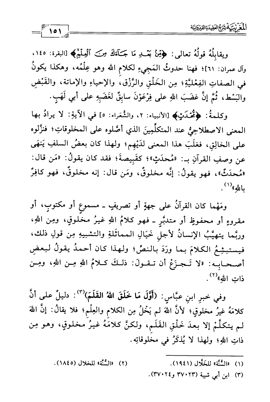 ومَهْما كان القرآنُ على جهةٍ أو تصريفٍ -مسموعٍ أو مكتوبٍ، أو مقروءٍ أو محفوظٍ أو متدبَّرٍ- فهو كلامُ اللهِ غيرُ مخلوقٍ، ومِن الله، وربَّما يتهيَّبُ الإنسانُ لأجلِ خَيَالِ المماثَلةِ والتشبيهِ مِن قولِ ذلك، فيستبشِعُ الكلامَ بما ورَدَ بالنصِّ؛ ولهذا كان أحمدُ يقولُ لبعضِ أصحابِه: "لا تَجزَعْ أن تقولَ: ذلكَ كلامُ الله مِن الله، ومِن ذاتِ اللهِ" (٢).