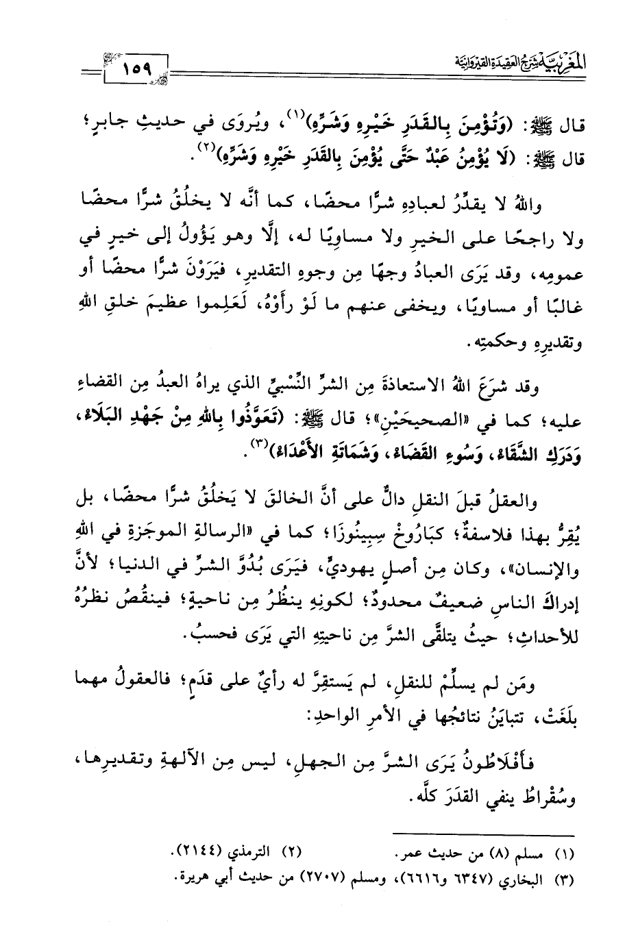 قال -صلى الله عليه وسلم-: (وَتُؤْمِنَ بِالقَدَرِ خَيْرِهِ وَشَرِّهِ) (١)، ويُروَى في حديثِ جابرٍ؛ قال -صلى الله عليه وسلم-: (لَا يُؤْمِنُ عَبْدٌ حَتَّى يُؤْمِنَ بِالقَدَرِ خَيْرِهِ وَشَرِّهِ) (٢).