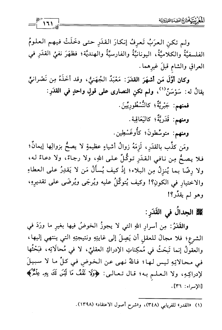 ولم تكنِ العرَبُ تَعرِفُ إنكارَ القدَرِ حتى دخَلَتْ فيهم العلومُ الفلسفيَّةُ والكلاميَّةُ، اليونانيَّةُ والفارسيَّةُ والهنديَّة؛ فظهَرَ نفيُ القدَرِ في العراقِ والشامِ قبلَ غيرِهما.