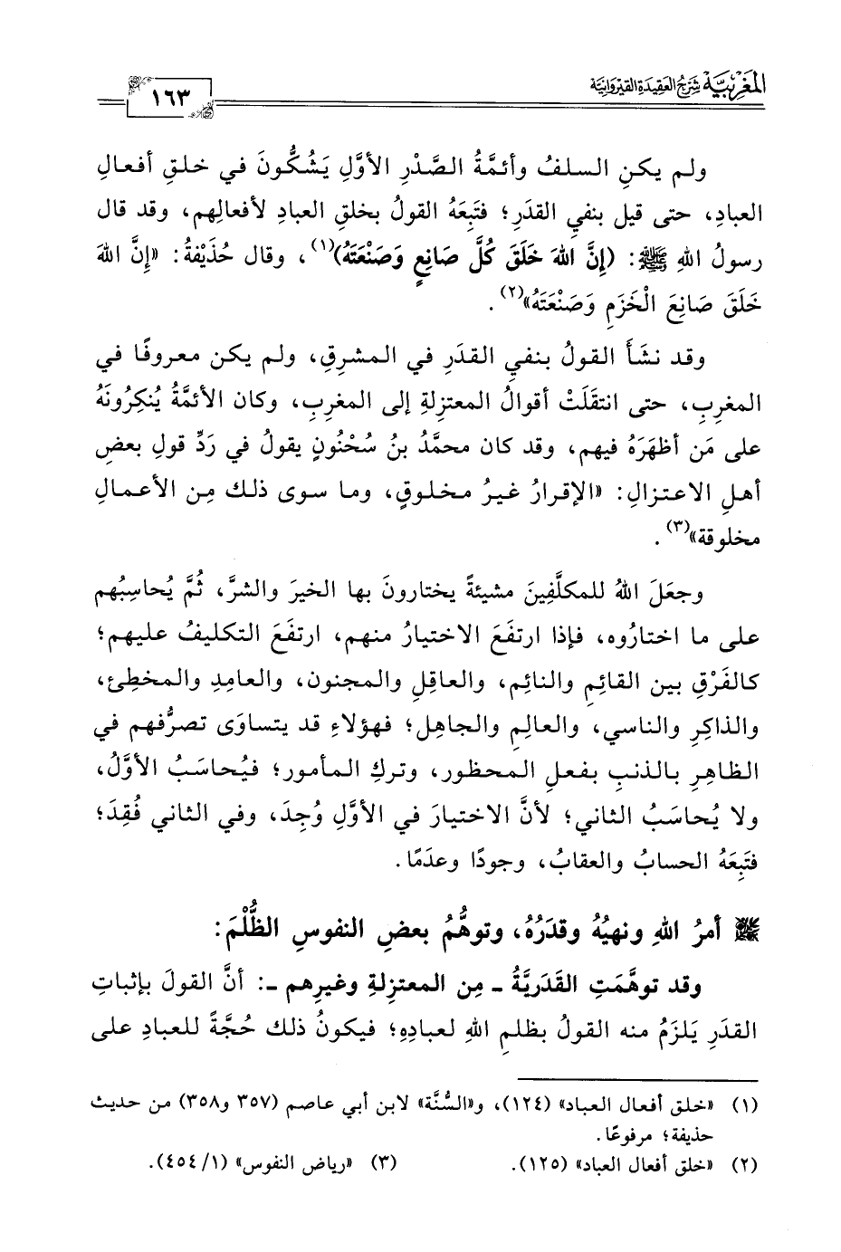 وقد نشَأَ القولُ بنفيِ القدَرِ في المشرِقِ، ولم يكن معروفًا في المغرِبِ، حتى انتقَلَتْ أقوالُ المعتزِلةِ إلى المغرِبِ، وكان الأئمَّةُ يُنكِرُونَهُ على مَن أظهَرَهُ فيهم، وقد كان محمَّدُ بن سُحْنُونٍ يقولُ في رَدِّ قولِ بعضِ أهلِ الاعتزالِ: "الإقرارُ غيرُ مخلوقٍ، وما سوى ذلك مِن الأعمالِ مخلوقة" (٣).