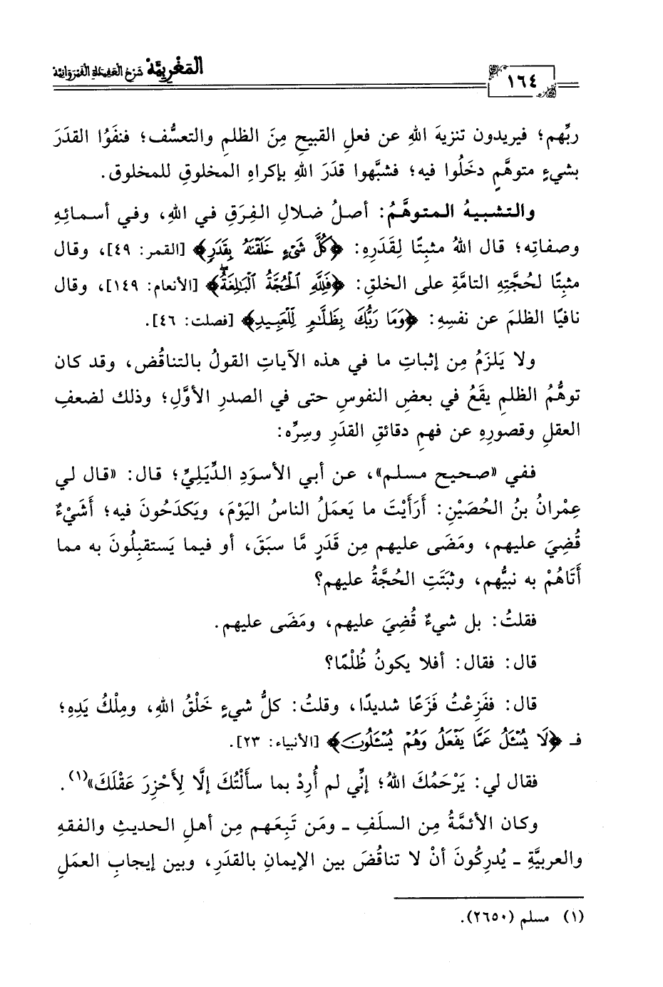 والتشبيهُ المتوهَّمُ: أصلُ ضلالِ الفِرَقِ في الله، وفي أسمائِهِ وصفاتِه؛ قال الله مثبِتًا لِقَدَرِهِ: {كُلَّ شَيْءٍ خَلَقْنَاهُ بِقَدَرٍ} [القمر: ٤٩]، وقال مثبِتًا لحُجَّتِهِ التامَّةِ على الخلقِ: {فَلِلَّهِ الْحُجَّةُ الْبَالِغَةُ} [الأنعام: ١٤٩]، وقال نافيًا الظلمَ عن نفسِهِ: {وَمَا رَبُّكَ بِظَلَّامٍ لِلْعَبِيدِ} [فصلت: ٤٦].