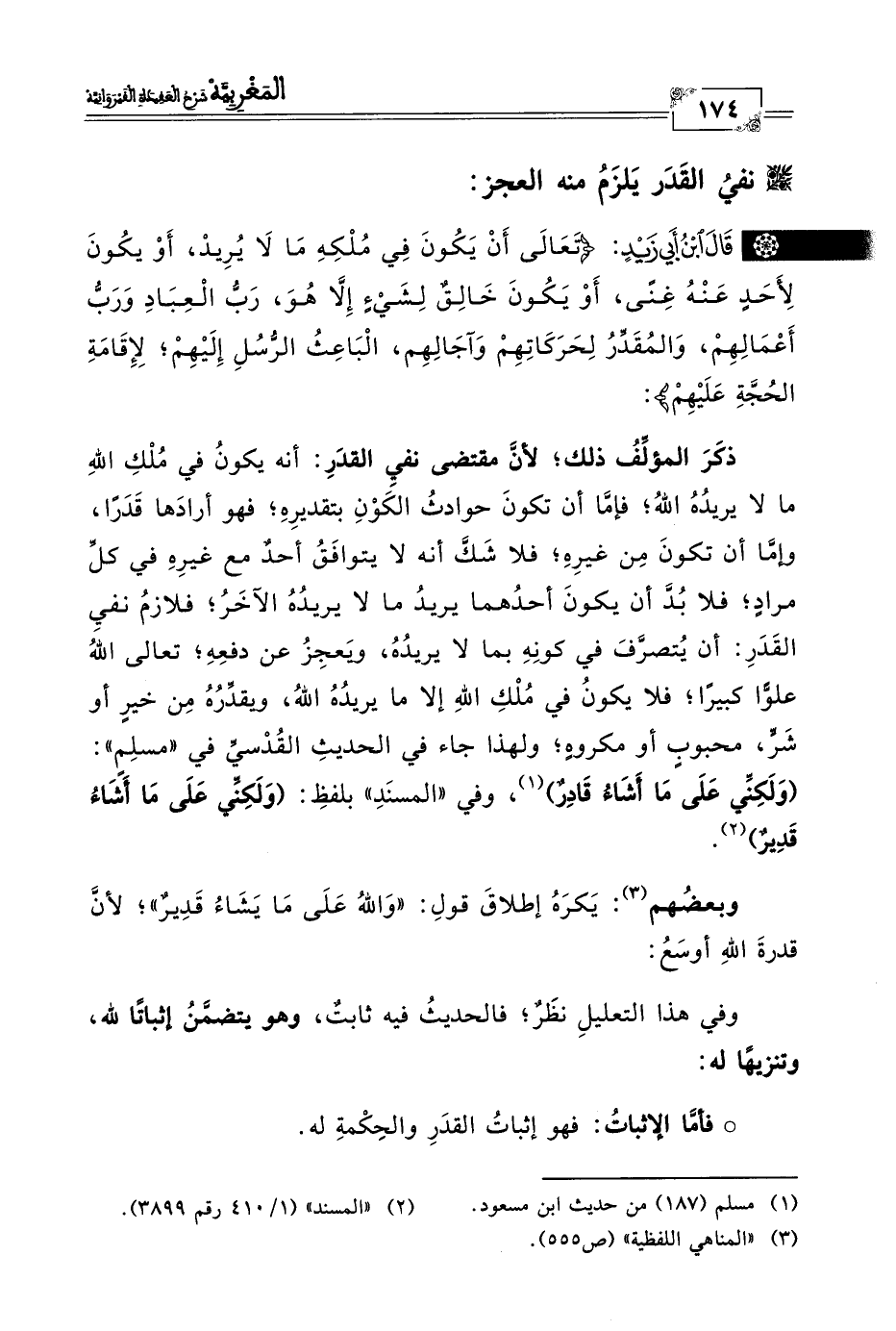 ذكَرَ المؤلِّفُ ذلك؛ لأنَّ مقتضى نفيِ القدَرِ: أنه يكونُ في مُلْكِ الله ما لا يريدُهُ الله؛ فإمَّا أن تكونَ حوادثُ الكَوْنِ بتقديرِهِ؛ فهو أرادَها قَدَرًا، وإمَّا أن تكونَ مِن غيرِهِ؛ فلا شَكَّ أنه لا يتوافَقُ أحدٌ مع غيرِهِ في كلِّ مرادٍ؛ فلا بُدَّ أن يكونَ أحدُهما يريدُ ما لا يريدُهُ الآخَرُ؛ فلازمُ نفيِ القَدَرِ: أن يُتصرَّفَ في كونِهِ بما لا يريدُهُ، ويَعجِزُ عن دفعِهِ؛ تعالى الله علوًّا كبيرًا؛ فلا يكونُ في مُلْكِ الله إلا ما يريدُهُ الله، ويقدِّرُهُ مِن خيرٍ أو شَرٍّ، محبوبٍ أو مكروهٍ؛ ولهذا جاء في الحديثِ القُدْسيِّ في "مسلِمٍ": (وَلَكِنِّي عَلَى مَا أَشَاءُ قَادِرٌ) (١)، وفي "المسنَدِ" بلفظِ: (وَلَكِنِّي عَلَى مَا أَشَاءُ قَدِيرٌ) (٢).