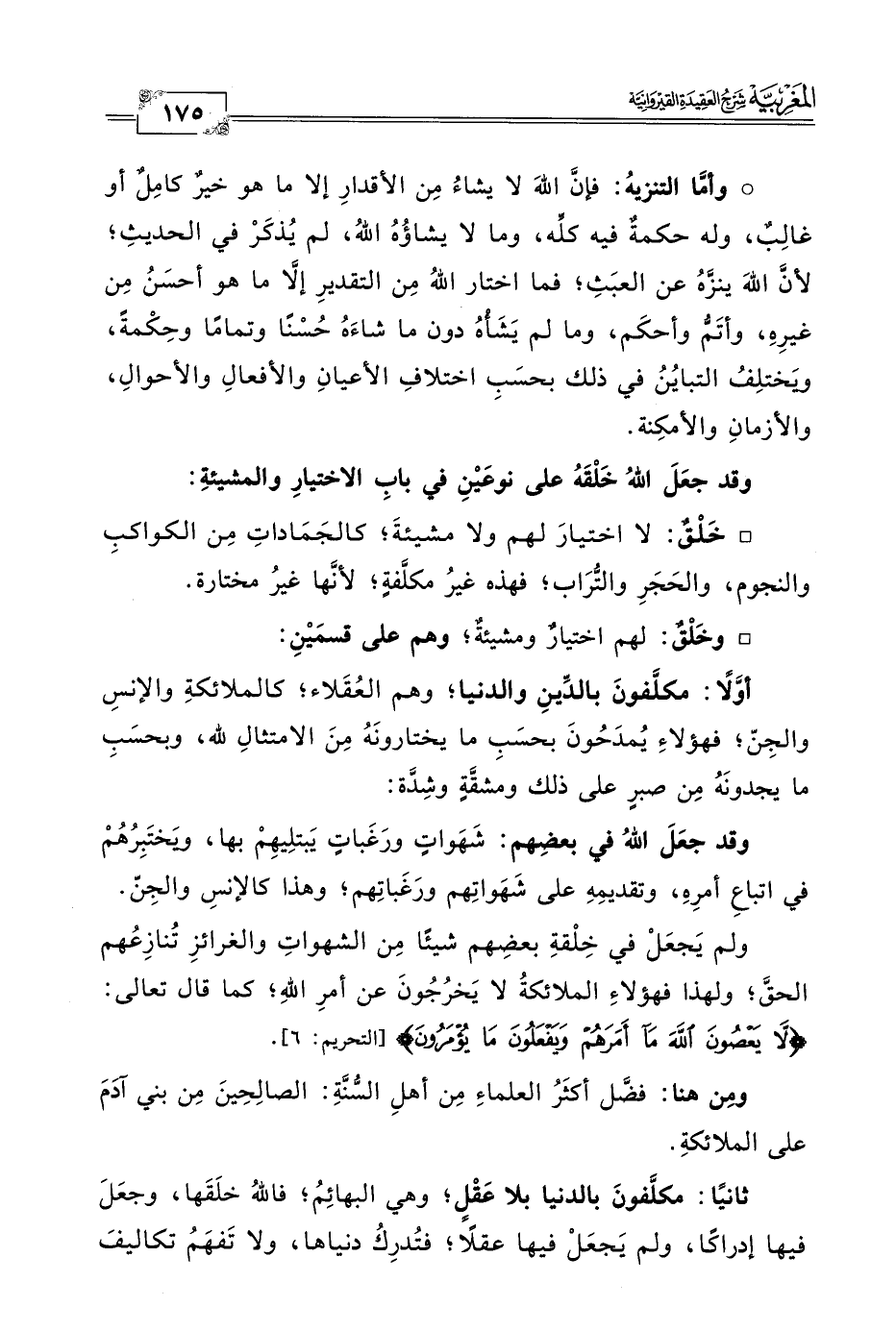 * وأمَّا التنزيهُ: فإنَّ اللهَ لا يشاءُ مِن الأقدارِ إلا ما هو خيرٌ كامِلٌ أو غالِبٌ، وله حكمةٌ فيه كلِّه، وما لا يشاؤُهُ اللهُ، لم يُذكَرْ في الحديثِ؛ لأنَّ الله ينزَّهُ عن العبَثِ؛ فما اختار الله مِن التقديرِ إلَّا ما هو أحسَنُ مِن غيرِه، وأتَمُّ وأحكَم، وما لم يَشَأْهُ دون ما شاءَهُ حُسْنًا وتمامًا وحِكْمةً، ويَختلِفُ التبايُنُ في ذلك بحسَبِ اختلافِ الأعيانِ والأفعالِ والأحوالِ، والأزمانِ والأمكِنة.