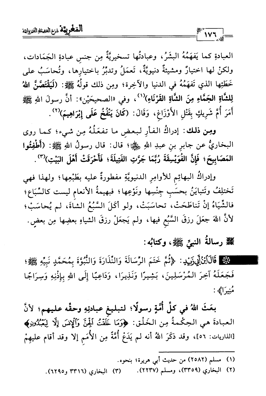 العبادةِ كما يَفهَمُهُ البشَرُ، وعبادتُها تسخيريَّةٌ مِن جنسِ عبادةِ الجَمَادات، ولكنْ لها اختيارٌ ومشيئةٌ دنيويَّةٌ، تَعمَلُ وتدبِّرُ باختيارِها، وتُحاسَبُ على خَطَئِها الذي تَفهَمُهُ في الدنيا والآخِرة؛ ومِن ذلك قولُهُ -صلى الله عليه وسلم-: (لَيَقْتَصَّنَ اللهُ لِلشَّاةِ الجَمَّاءِ مِنَ الشَّاةِ القَرْنَاءِ) (١)، وفي "الصحيحَيْن": أنَّ رسولَ اللهِ -صلى الله عليه وسلم- أَمَرَ أُمَّ شَرِيكٍ بِقَتْلِ الأَوْزَاغِ، وَقَالَ: (كَانَ يَنْفُخُ عَلَى إِبْرَاهِيمَ) (٢).