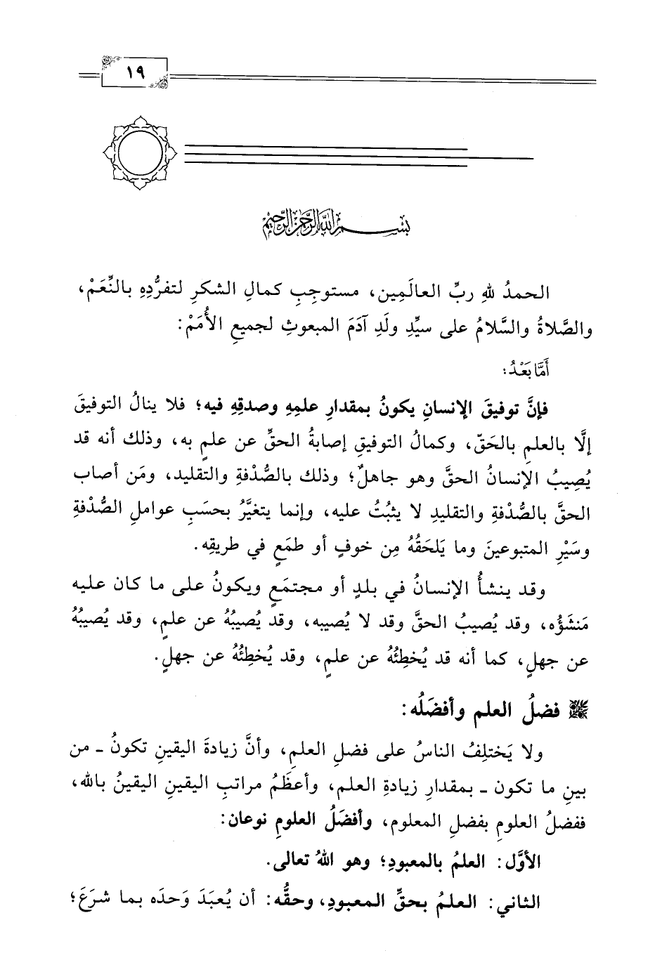 ولا يَختلِفُ الناسُ على فضلِ العلم، وأنَّ زيادةَ اليقينِ تكونُ -من بينِ ما تكون- بمقدارِ زيادةِ العلم، وأعظَمُ مراتبِ اليقينِ اليقينُ بالله، ففضلُ العلومِ بفضلِ المعلوم، وأفضَلُ العلومِ نوعان: