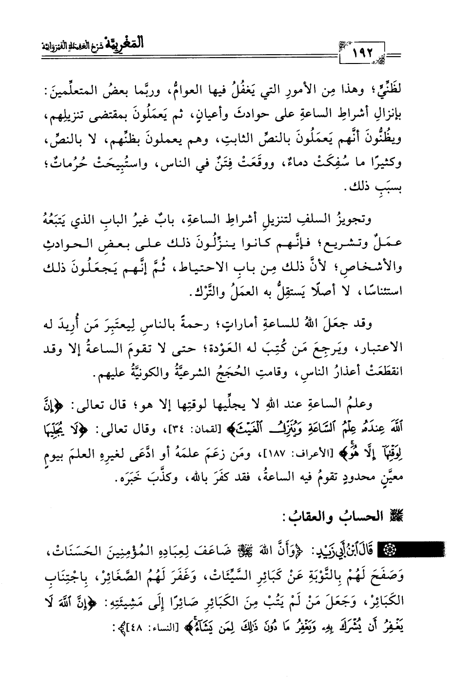 لظَنِّيٍّ؛ وهذا مِن الأمورِ التي يَغفُلُ فيها العوامُّ، وربَّما بعضُ المتعلِّمينَ: بإنزالِ أشراطِ الساعةِ على حوادثَ وأعيانٍ، ثم يَعمَلُونَ بمقتضى تنزيلِهم، ويظُنُّونَ أنَّهم يَعمَلُونَ بالنصِّ الثابتِ، وهم يعملونَ بظنِّهم، لا بالنصِّ، وكثيرًا ما سُفِكَتْ دماءٌ، ووقَعَتْ فِتَنٌ في الناس، واستُبِيحَتْ حُرُماتٌ؛ بسبَبِ ذلك.