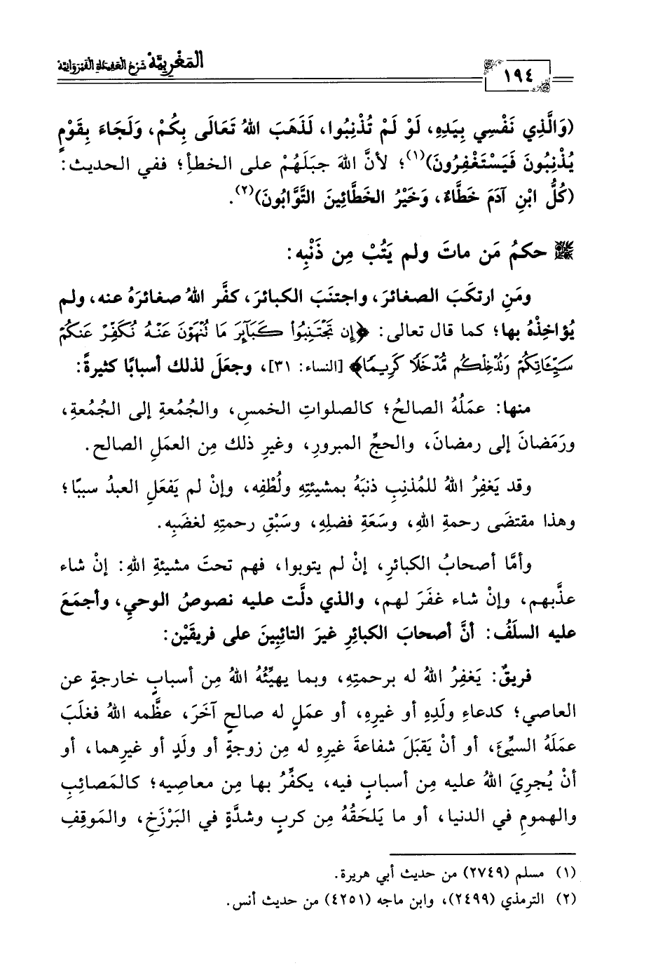 وقد يَغفِرُ اللهُ للمُذنِبِ ذنبَهُ بمشيئتِهِ ولُطْفِه، وإنْ لم يَفعَلِ العبدُ سببًا؛ وهذا مقتضَى رحمةِ الله، وسَعَةِ فضلِه، وسَبْقِ رحمتِهِ لغضَبِه.