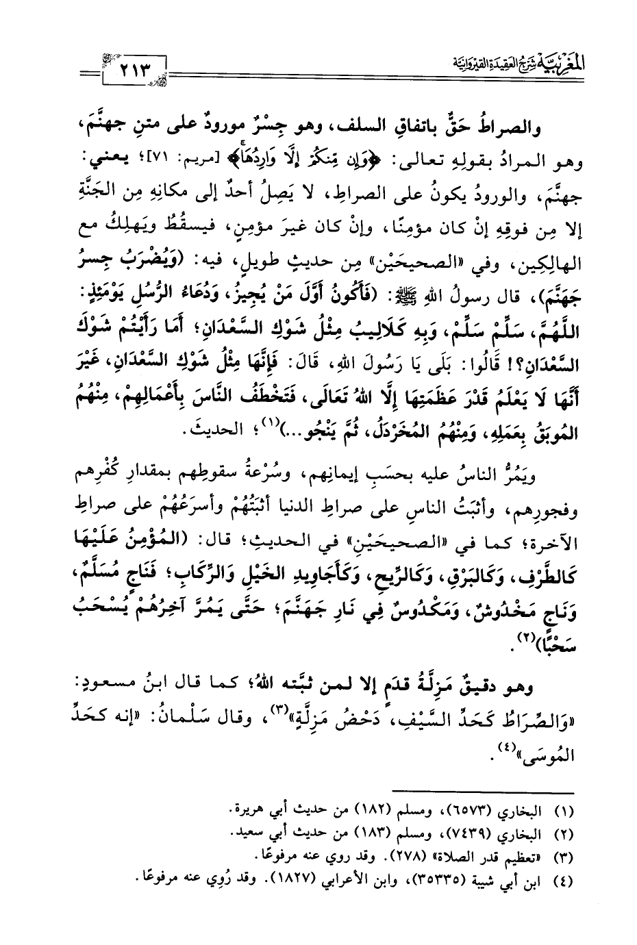 والصراطُ حَقٌّ باتفاقِ السلف، وهو جِسْرٌ مورودٌ على متنِ جهنَّمَ، وهو المرادُ بقولِهِ تعالى: {وَإِنْ مِنْكُمْ إِلَّا وَارِدُهَا} [مريم: ٧١]؛ يعني: جهنَّمَ، والورودُ يكونُ على الصراطِ، لا يَصِلُ أحدٌ إلى مكانِهِ مِن الجَنَّةِ إلا مِن فوقِهِ إنْ كان مؤمِنًا، وإنْ كان غيرَ مؤمِنٍ، فيسقُطُ ويَهلِكُ مع الهالِكِين، وفي "الصحيحَيْن" مِن حديثٍ طويلٍ، فيه: (وَيُضْرَبُ جِسرُ جَهَنَّمَ)، قال رسولُ اللهِ -صلى الله عليه وسلم-: (فَأَكُونُ أَوَّلَ مَنْ يُجِيزُ، وَدُعَاءُ الرُّسُلِ يَوْمَئِذٍ: اللَّهُمَّ، سَلِّمْ سَلِّمْ، وَبِهِ كَلَالِيبُ مِثْلُ شَوْكِ السَّعْدَانِ؛ أَمَا رَأَيْتُمْ شَوْكَ السَّعْدَانِ؟ ! قَالُوا: بَلَى يَا رَسُولَ الله، قَالَ: فَإِنَّهَا مِثْلُ شَوْكِ السَّعْدَانِ، غَيْرَ أَنَّهَا لَا يَعْلَمُ قَدْرَ عَظَمَتِهَا إِلَّا اللهُ تَعَالَى، فَتَخْطَفُ النَّاسَ بِأَعْمَالِهِمْ، مِنْهُمُ المُوبَقُ بِعَمَلِهِ، وَمِنْهُمُ المُخَرْدَلُ، ثُمَّ يَنْجُو ... ) (١)؛ الحديثَ.