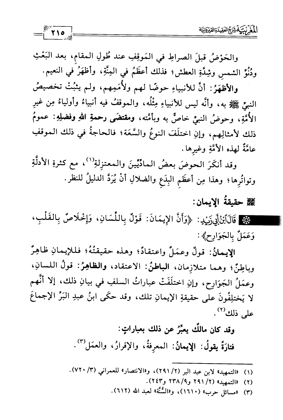 * قَالَ ابْنُ أَبي زَيْدٍ: (وَأَنَّ الإِيمَانَ: قَوْلٌ بِاللِّسَانِ، وَإِخْلَاصٌ بِالقَلْبِ، وَعَمَلٌ بِالجَوَارِح):
